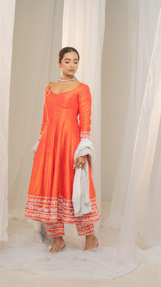 Kesar-Pista Orange Raw Silk Anarkali with White Embroidery and Organza Dupatta