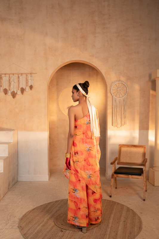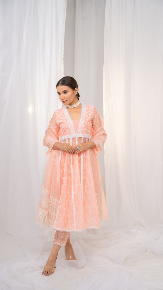 Ethereal Kesari Organza Anarkali with Safed Embroidery, Pants, and Dupatta