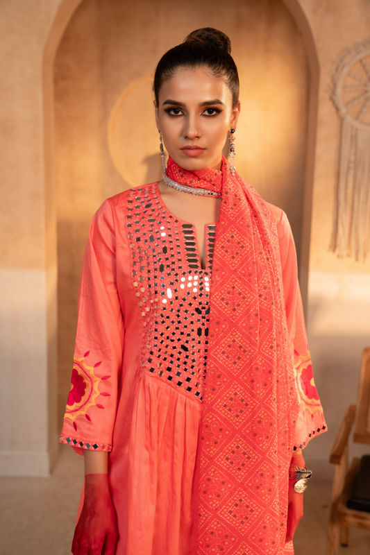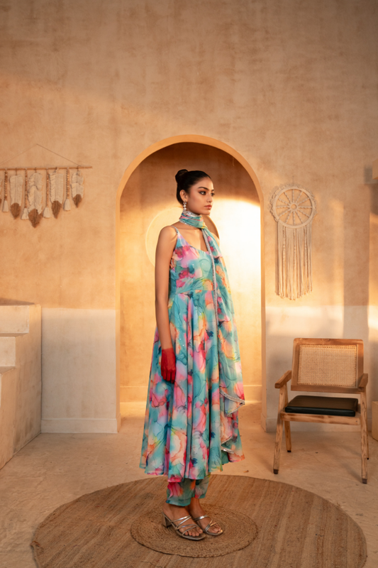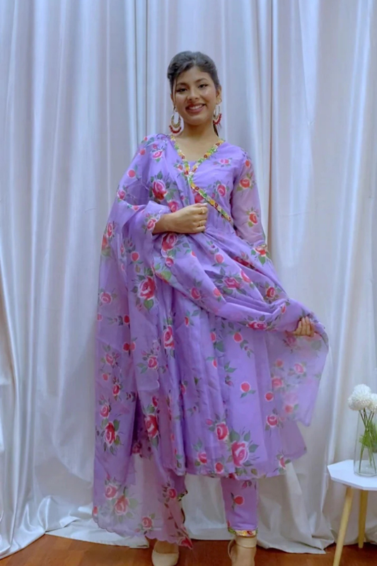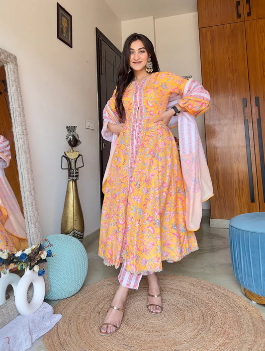 Floral Printed Muslin Cotton Anarkali Suit with Pants and Dupatta