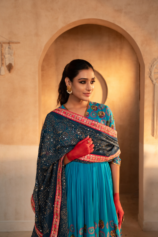 Green Printed Kurta Sharara Set with Bandhani Dupatta and Exquisite Mirror Work