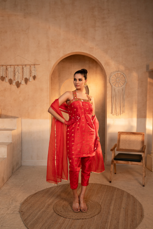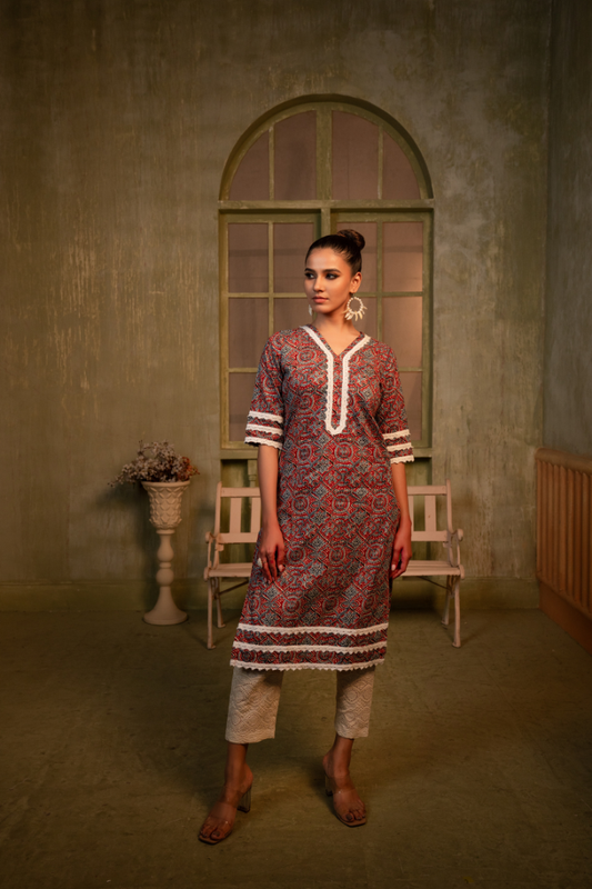 Red Cotton Satin Kurta with Delicate White Embroidery