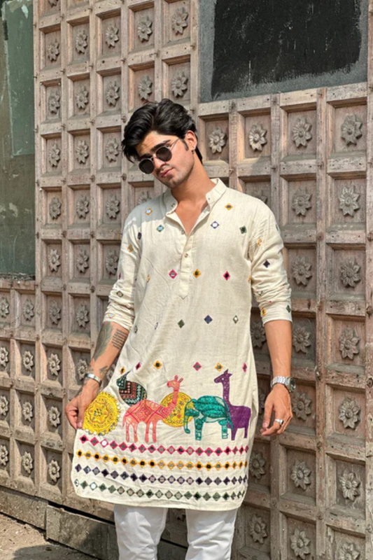 Comfy White Cotton Kurta with Colorful Embroidered Patches (Only Kurta)