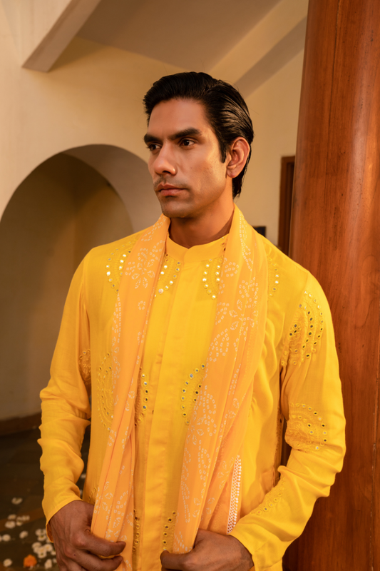 Brilliant Sun Yellow Bandhani White Embroidery Kurta