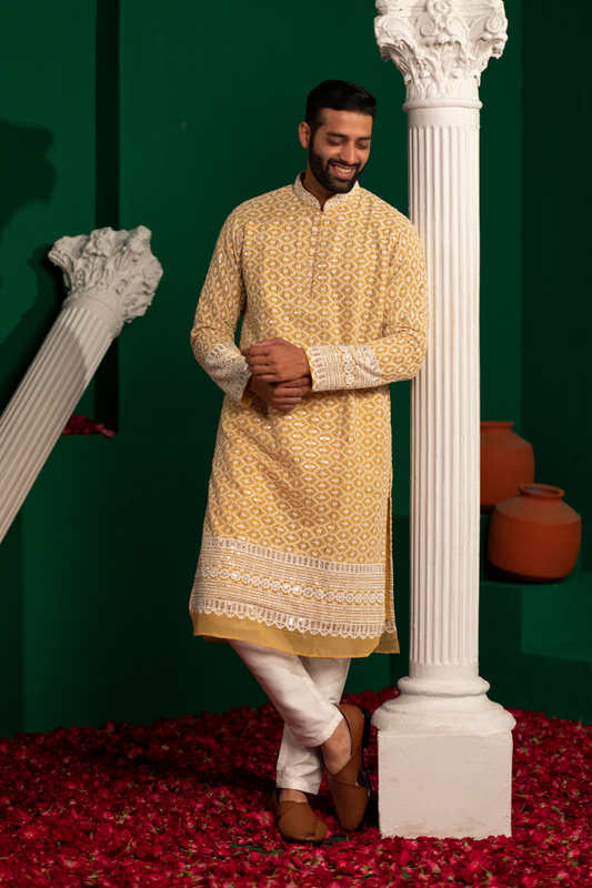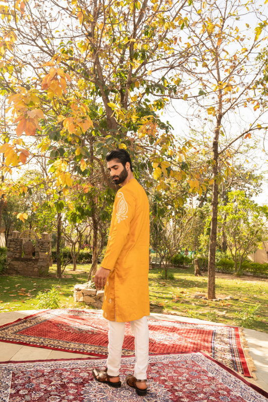 Sunshine Yellow Kurta with Traditional Deer and Peacock Print Kurta