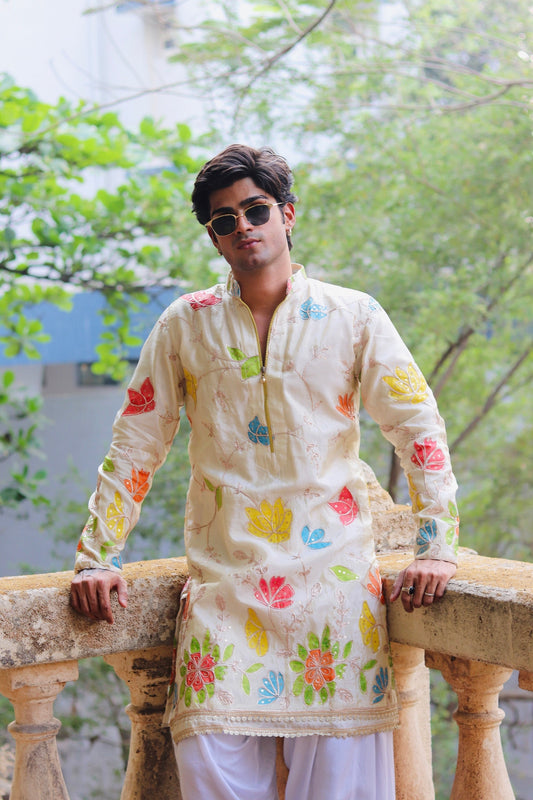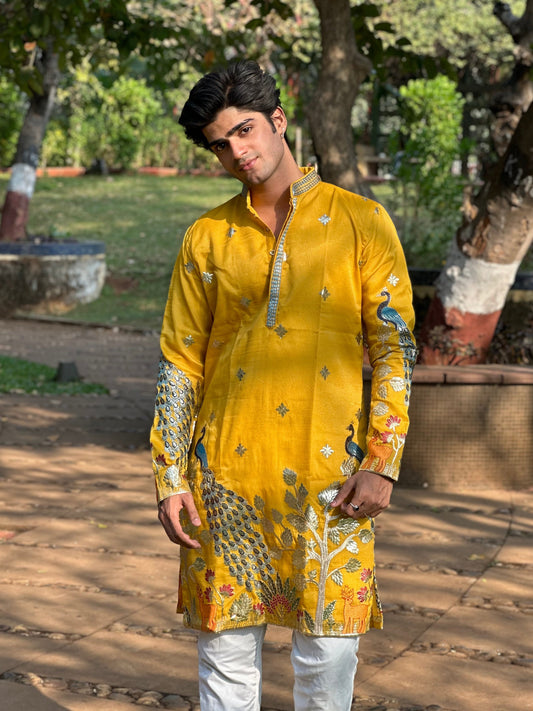 Sunshine Yellow Kurta with Traditional Deer and Peacock Print Kurta