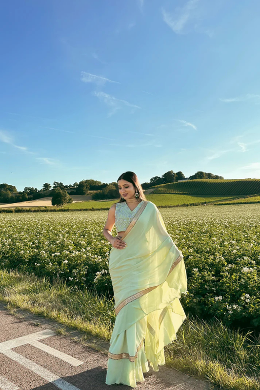 Ruffled Chiffon Saree and Exquisite Silk Blouse with Collar Embellishments