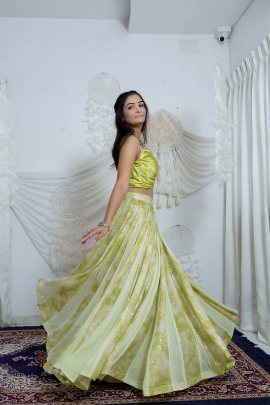 Green Printed Sequence lehenga And Drapped Blouse