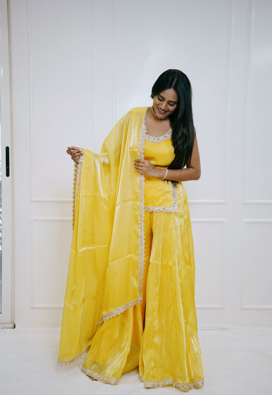 Beige Draping Palazzo Set with Organza Jacket and Dupatta