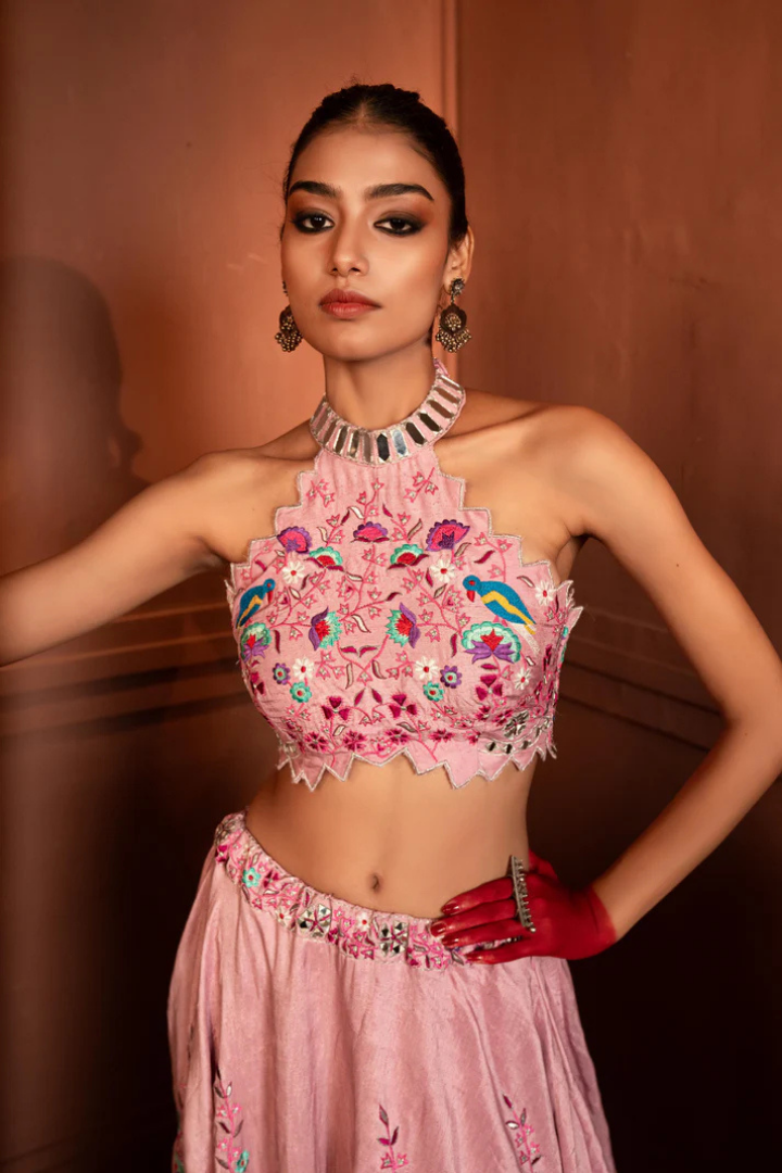 Embrace modern elegance with the Abigail crop top and skirt set. Crafted entirely from luxurious raw silk, this two-piece ensemble offers a sophisticated and chic look perfect for contemporary celebrations and stylish events.