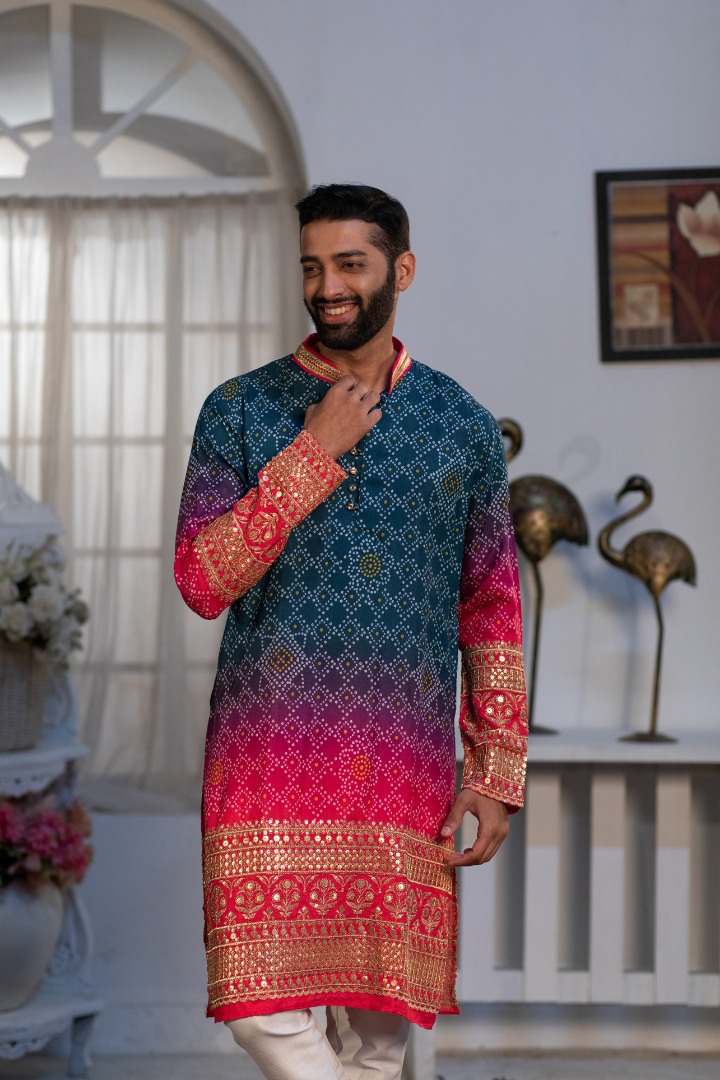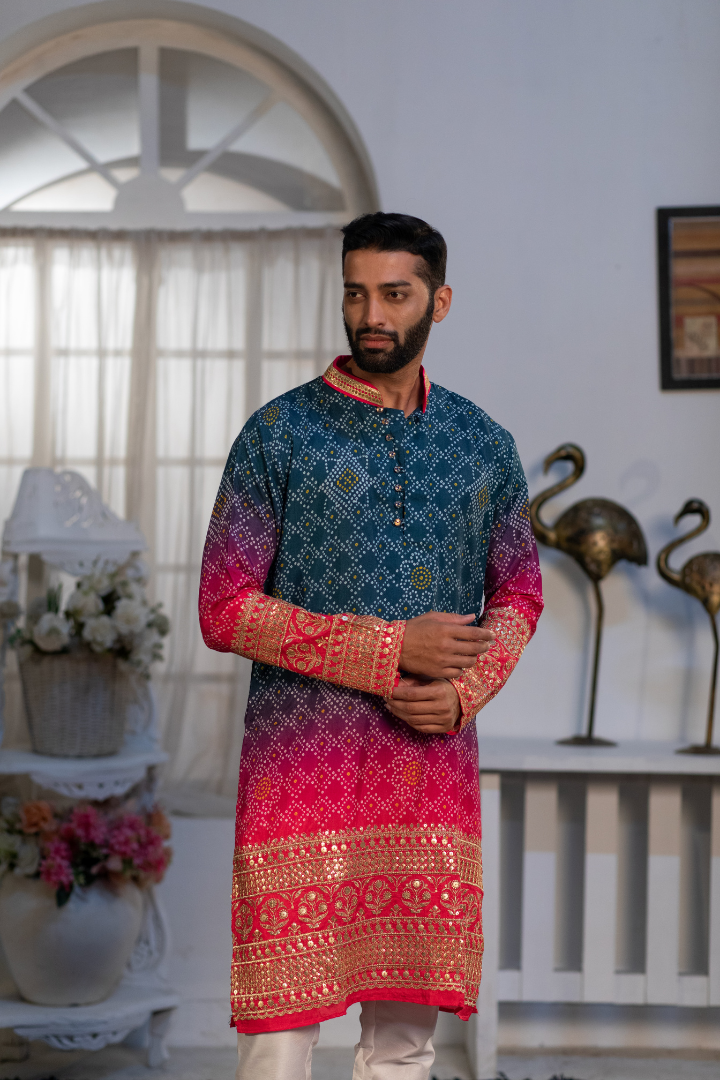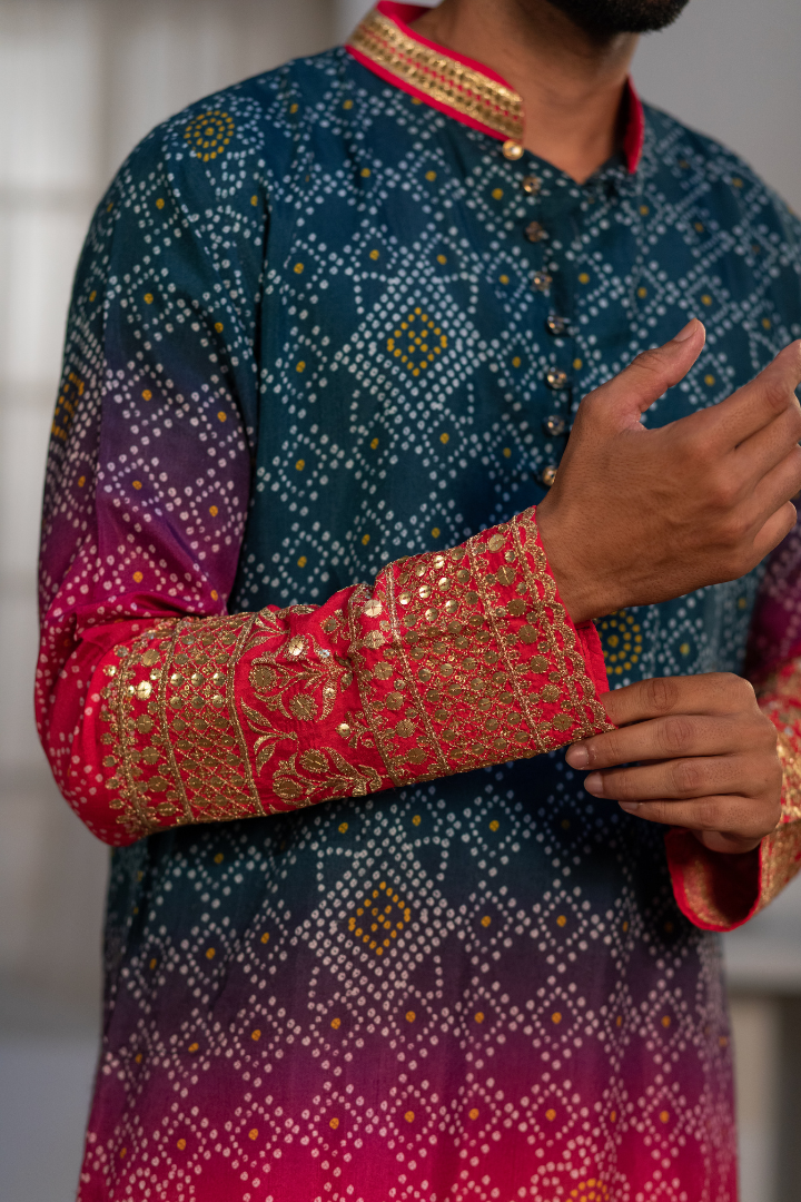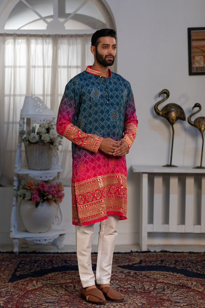 A graceful kurta in alice blue with hot pink and gold sequin embroidery. The blended silk adds luxury to the design.