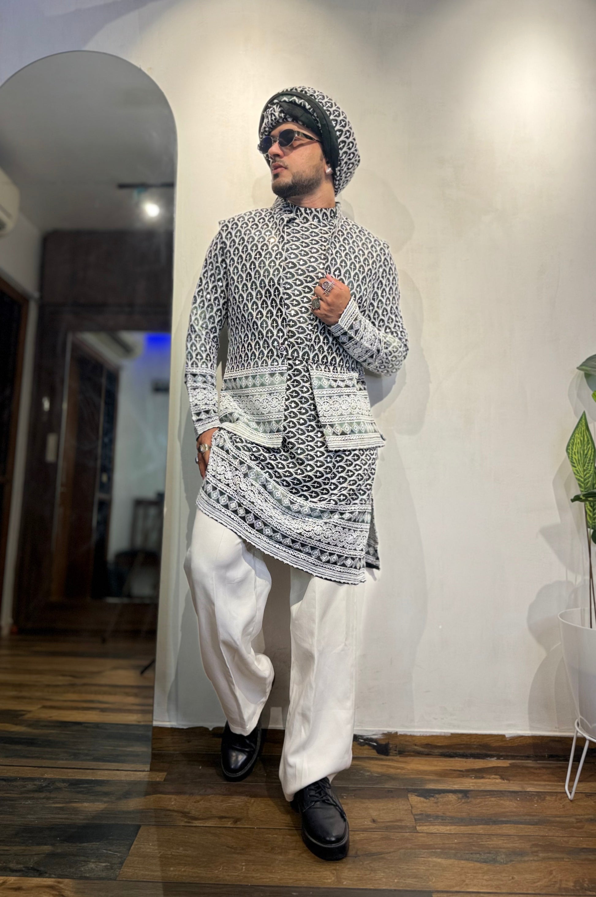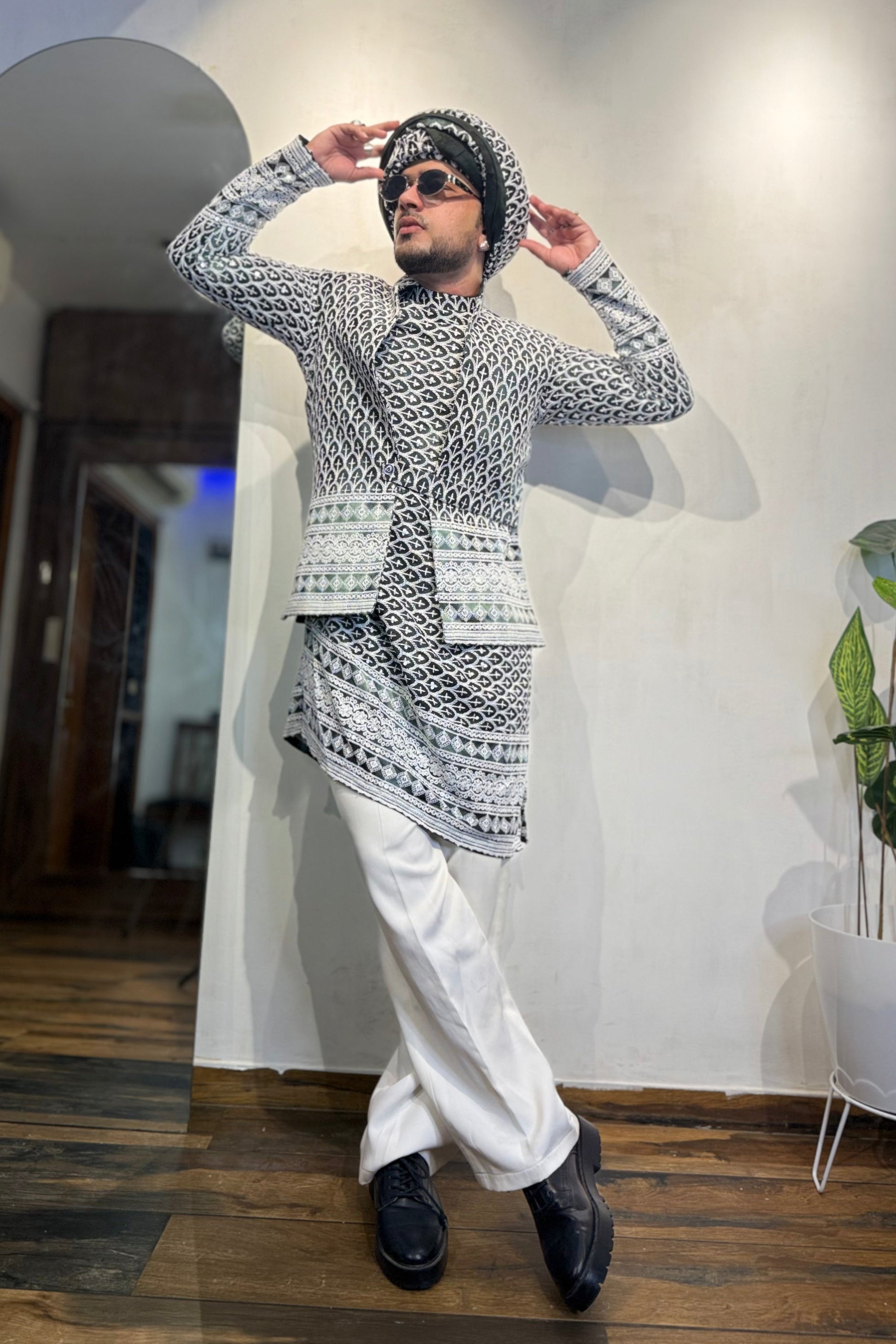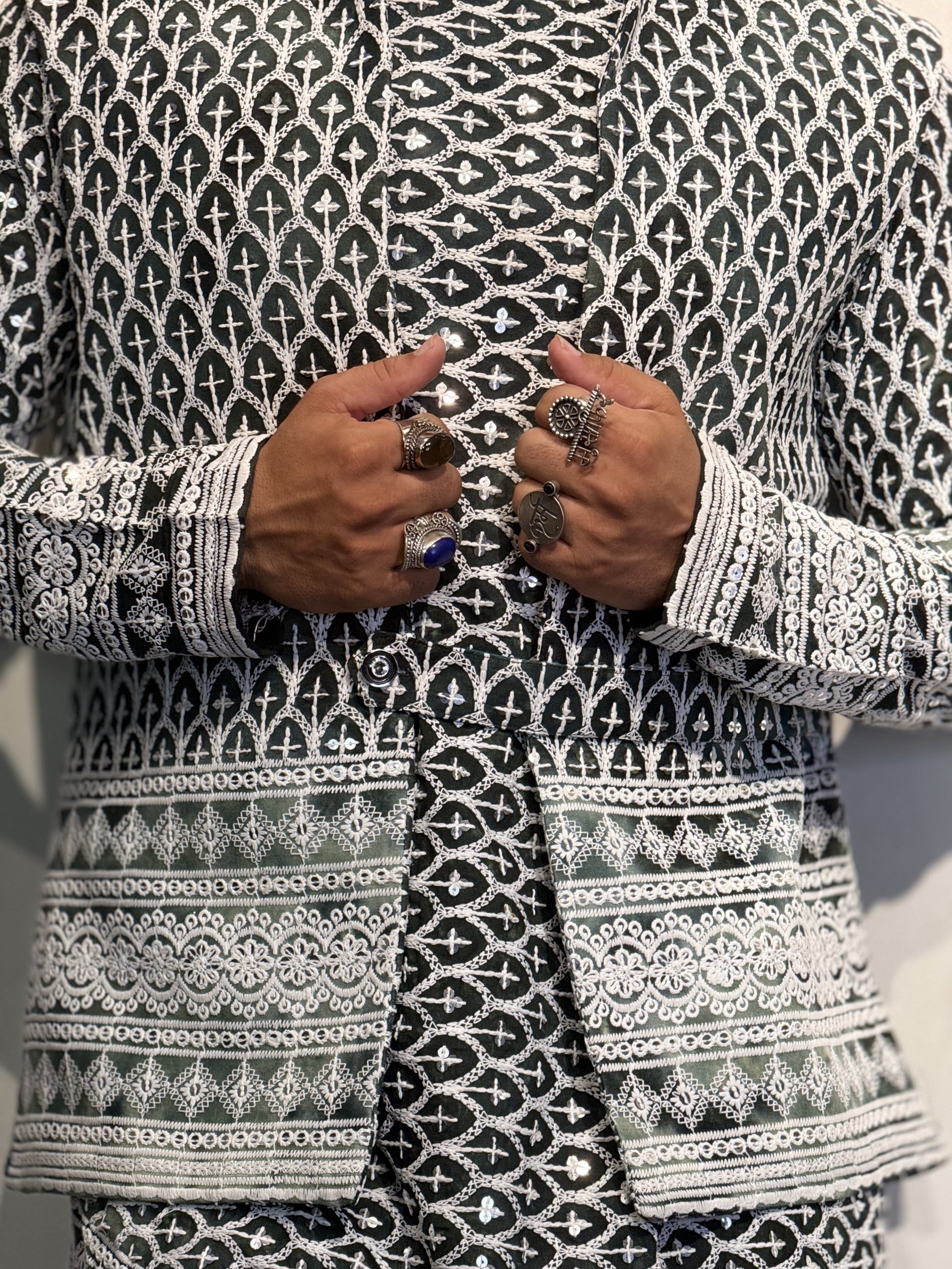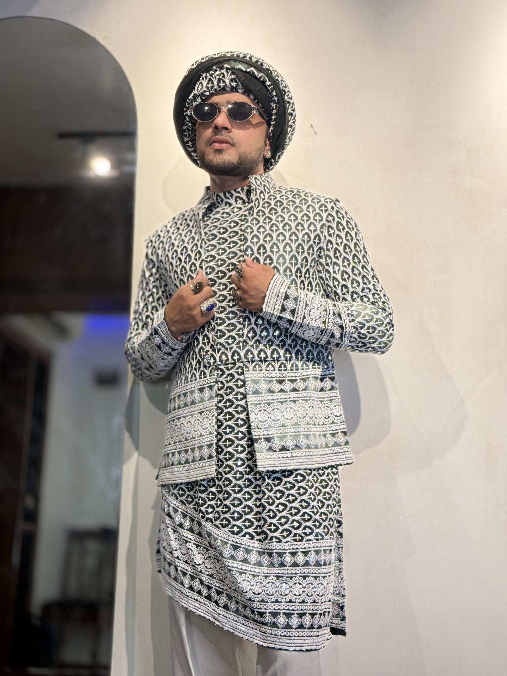 Botty Green Koti Kurta is a set with a green kurta and a matching jacket (koti). The kurta is straight and simple. The jacket goes over the kurta and looks tidy. The cotton feels soft and comfortable.