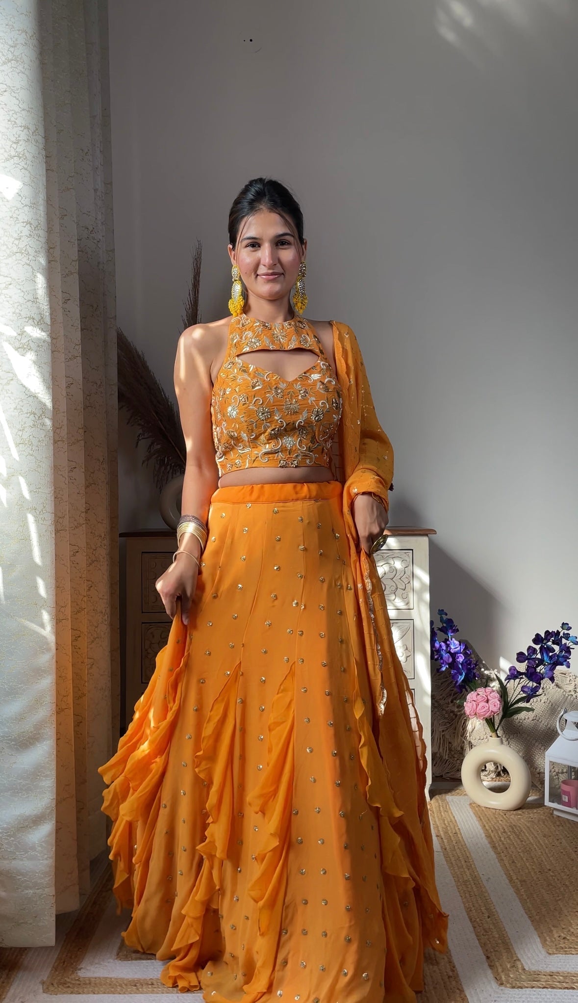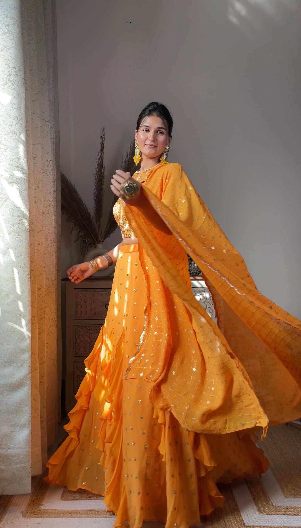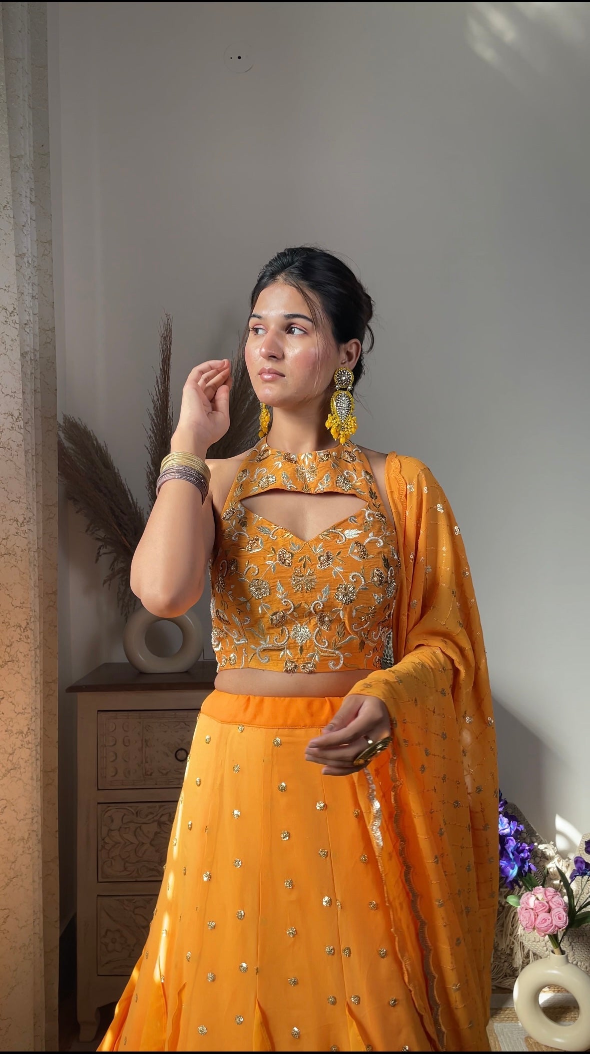 This lehenga in bright yellow georgette has fine embroidery. The skirt is wide and flows easily. Made with light fabric, it stays comfortable through the day. The yellow tone looks fresh and warm. Suitable for festivals, weddings, or family gatherings. Style with sandals and light jewelry.