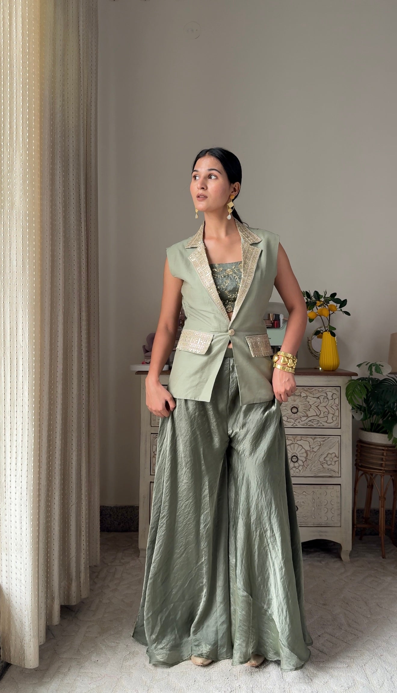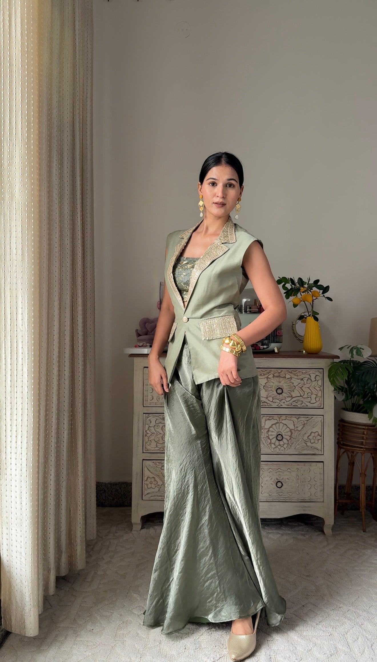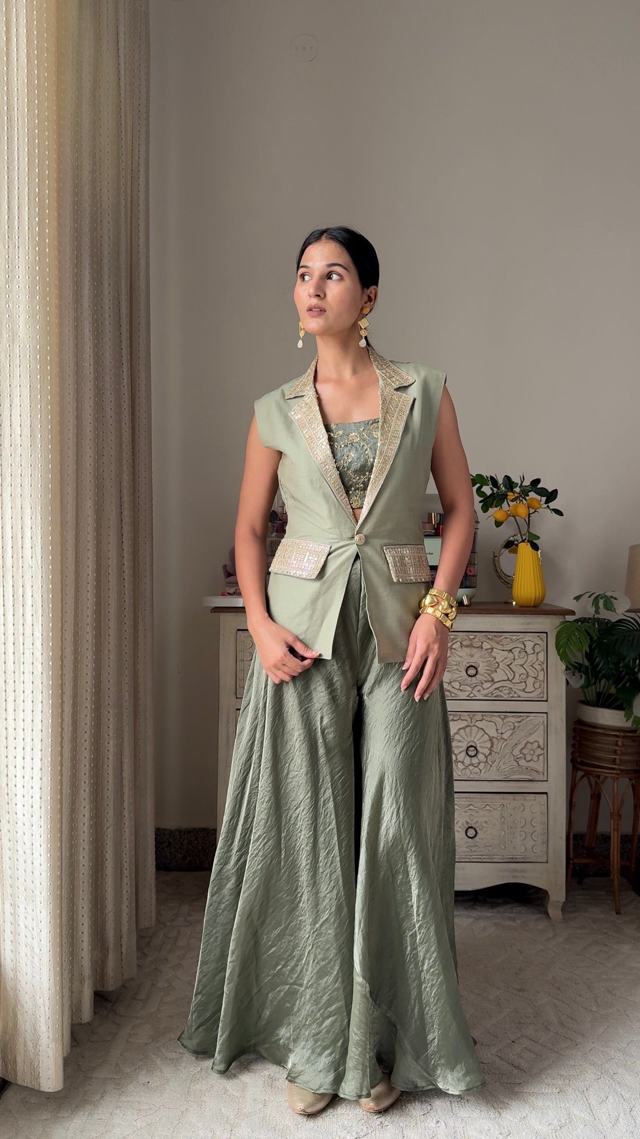 Castleton Green Blazer Three Piece includes a blazer, a waistcoat, and trousers. The fabric feels smooth. The blazer has a notch lapel with one button. The trousers are slim fit. The fit is clean, so it looks smart but not tight. Good for weddings, parties, or occasions. Pair it with clean shoes.