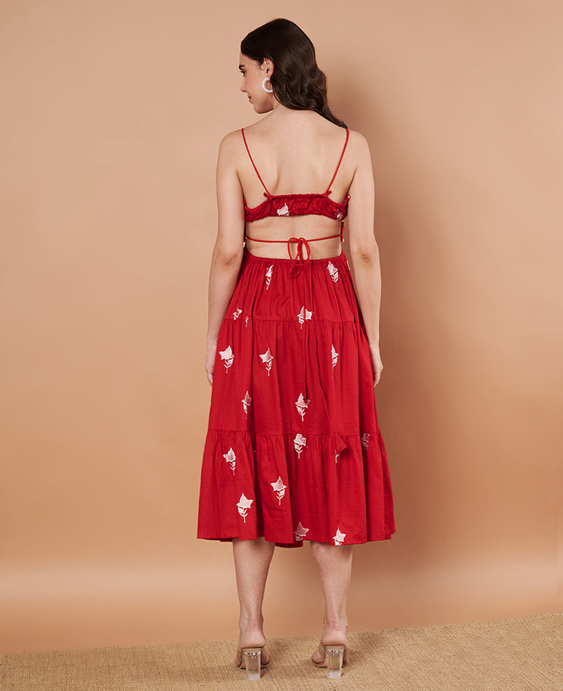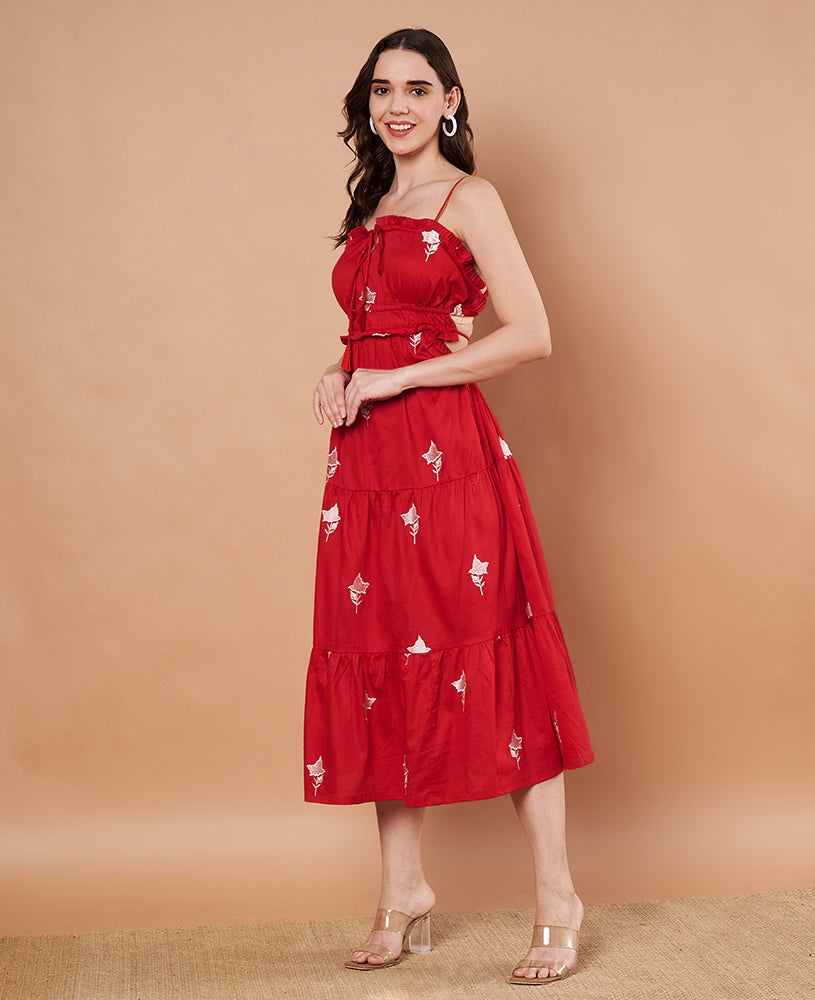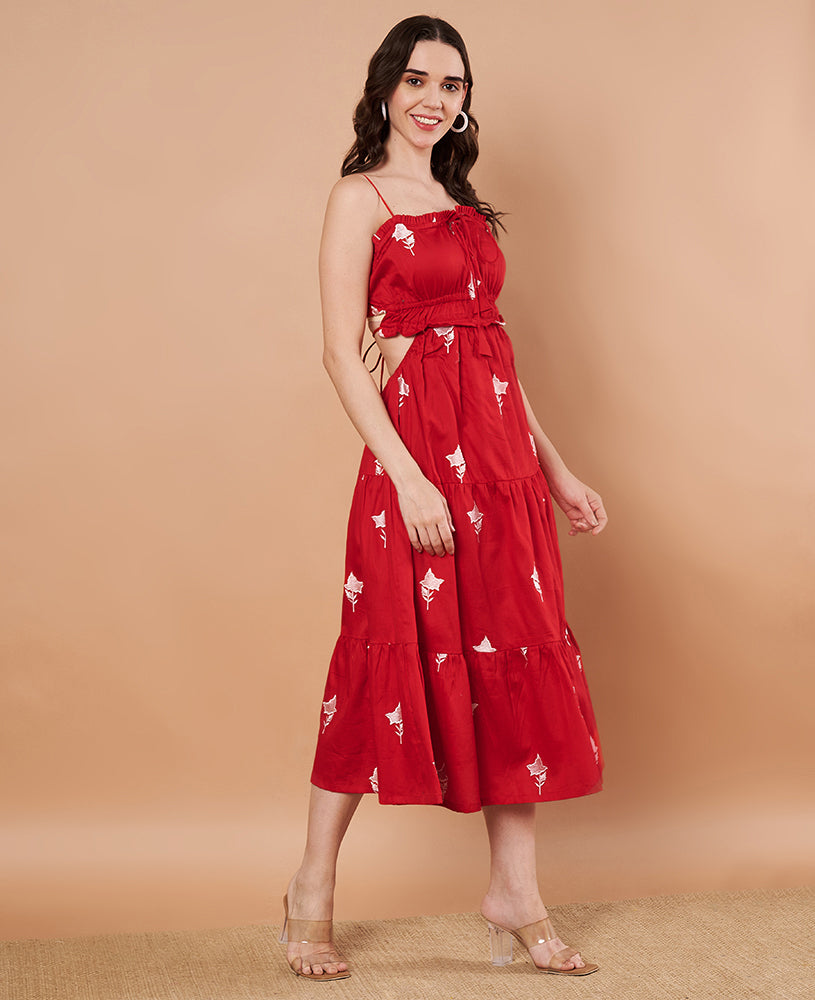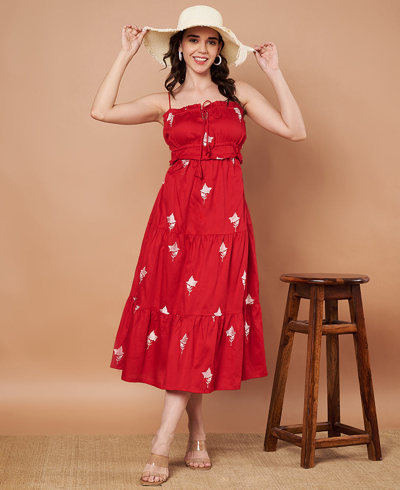 Chilli Red Frock is made from soft, flowy fabric. The red colour is rich and strong. The frock has a flared skirt that moves easily. The top fits well but feels comfortable. The fabric is light, so you can wear it for hours. Good for weddings, parties, or family events. Small jewellery is enough.
