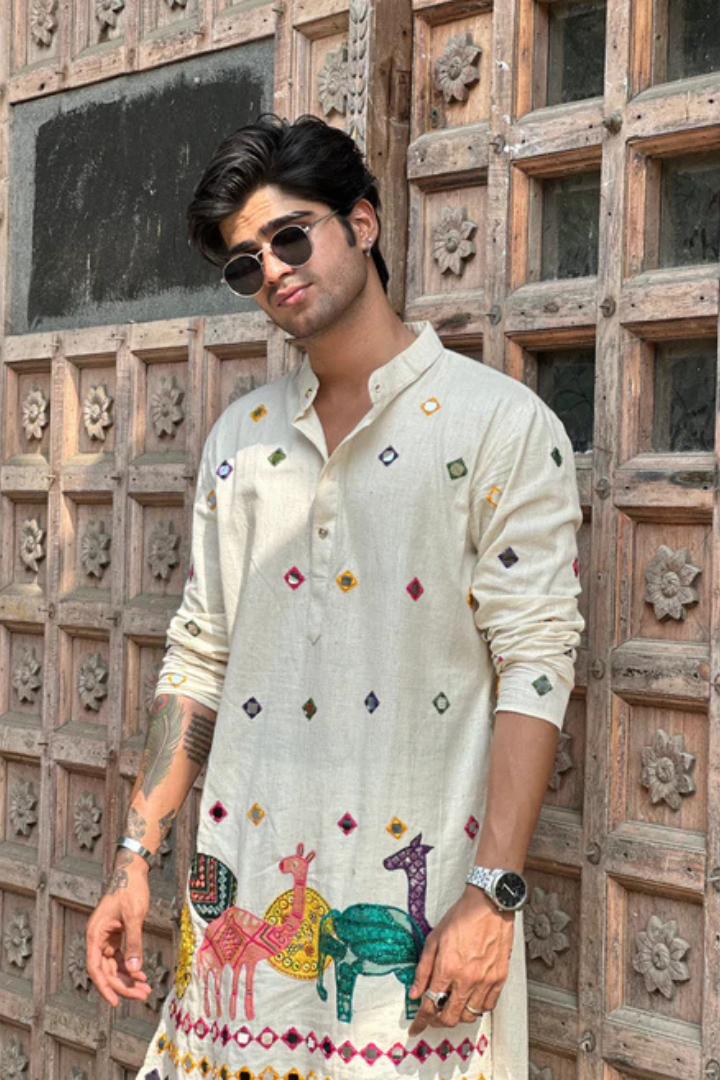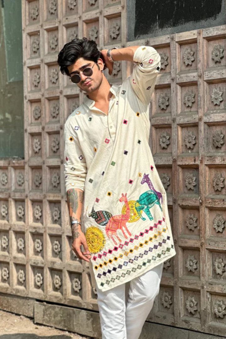 Here's a kurta that combines comfort with style. Made from soft, flexible cotton, we've added colorful embroidered patches to make it special while keeping it totally wearable. It's the kind of piece you'll reach for again and again.