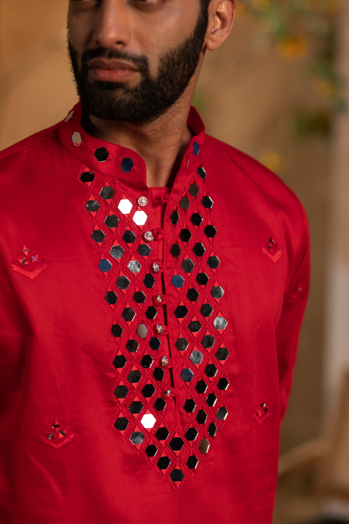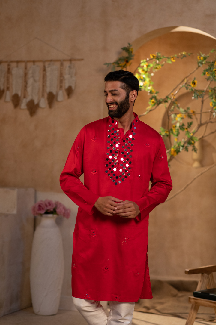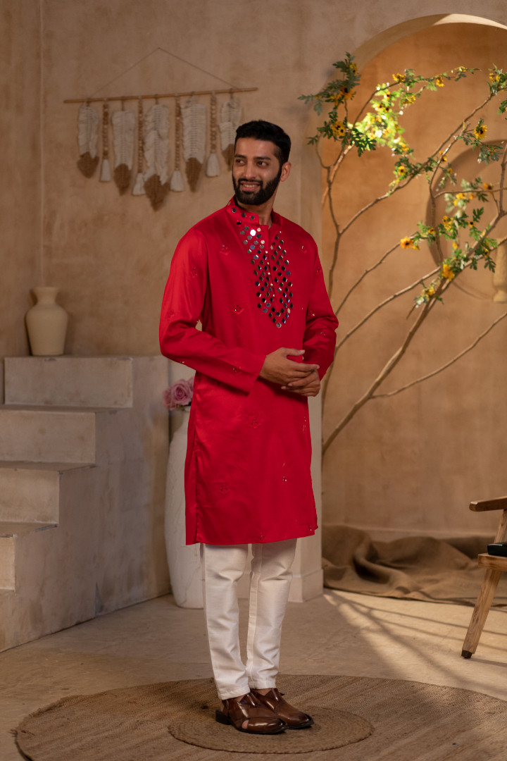 A refined kurta with tone-on-tone embroidery in crimson red. The cotton satin provides a subtle sheen to the design.