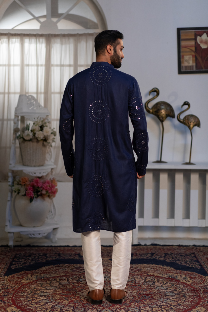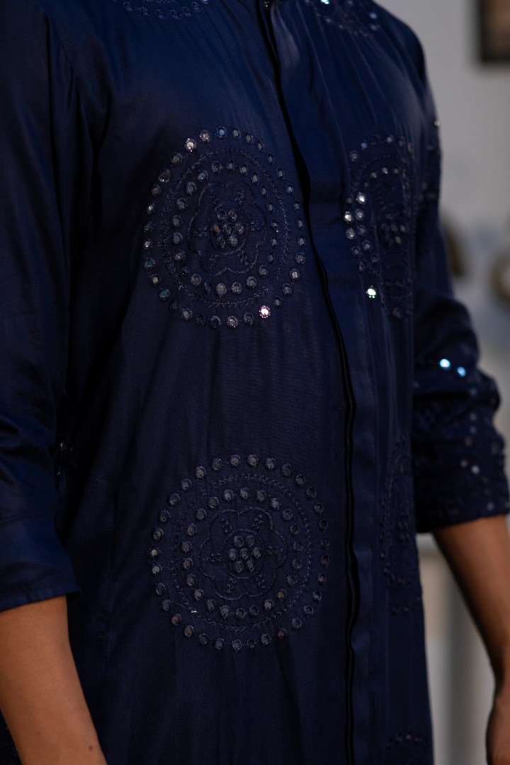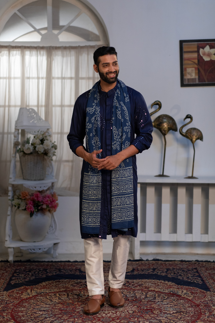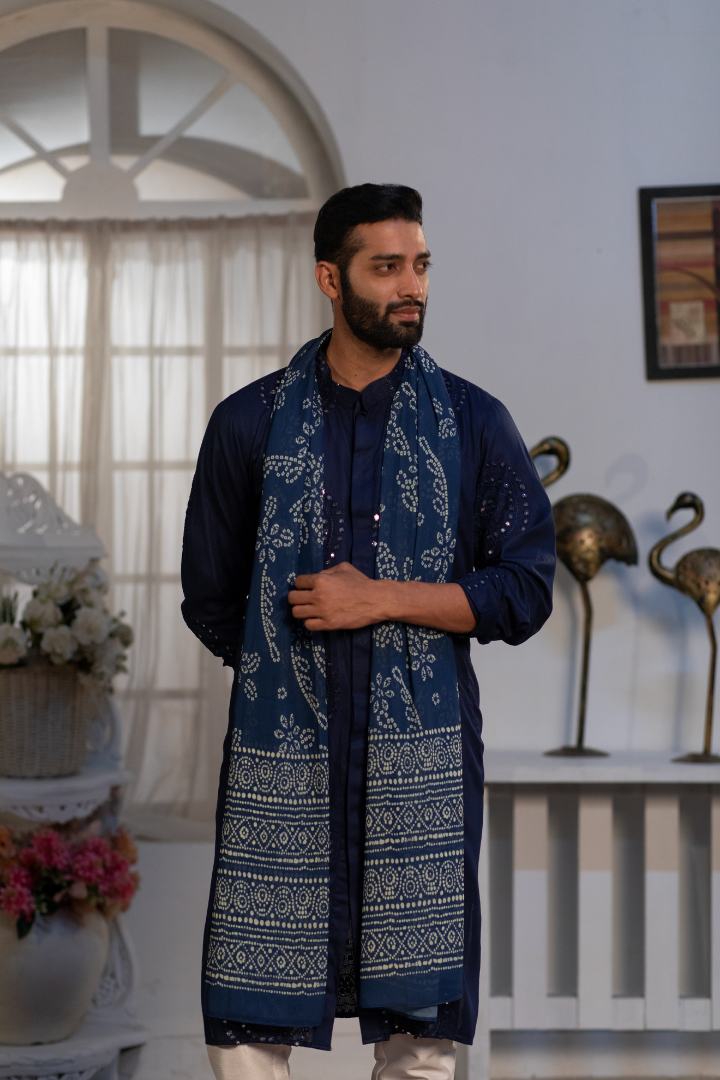 A fusion kurta combining traditional Bandhani with mirror and foil work. The dark blue rayon cotton creates rich texture.