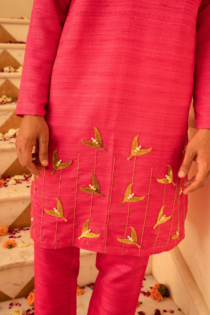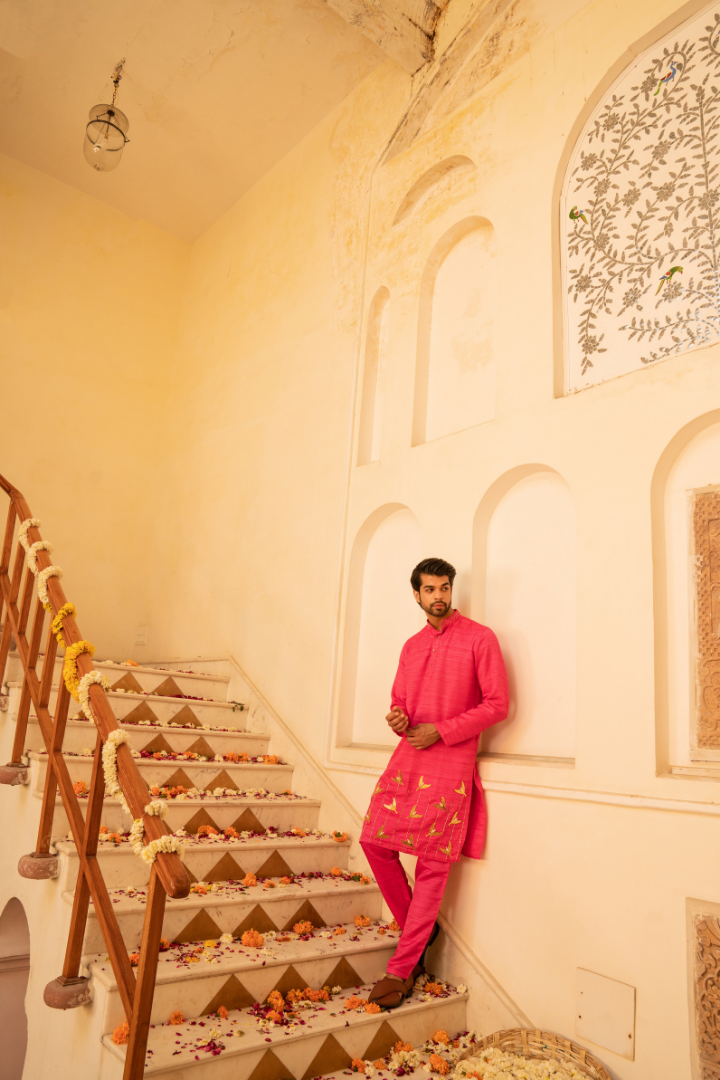 Embrace feminine elegance with this charming strawberry pink kurta set. The delicate pink hue is enhanced by the shimmering crystal and mirror work, creating a look that's both playful and sophisticated.