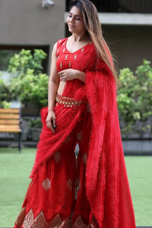 Red Silk Blouse & Net Worked Sharara With Feather Dupatta