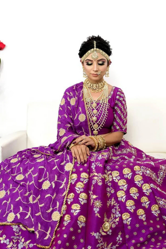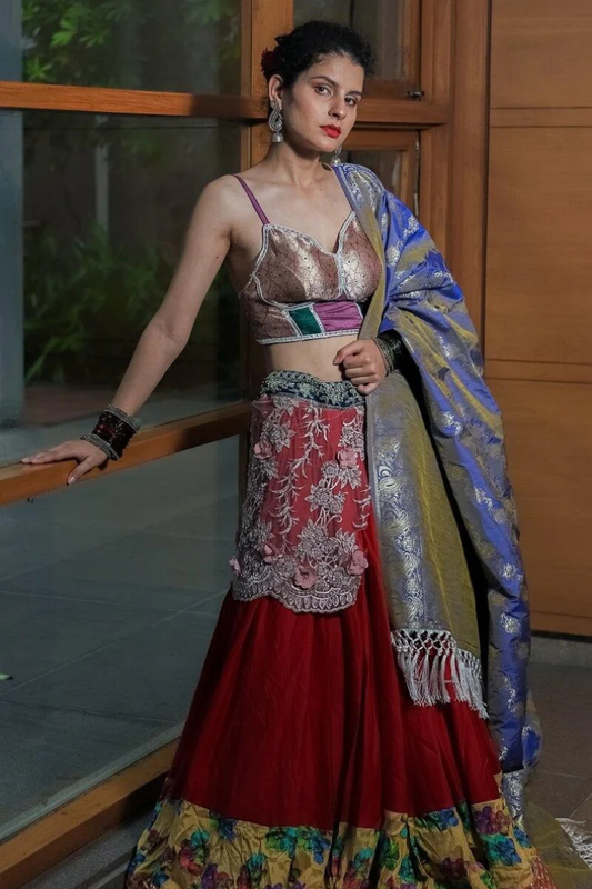 Red Lehenga With Pink blouse & Purple Silk Dupatta