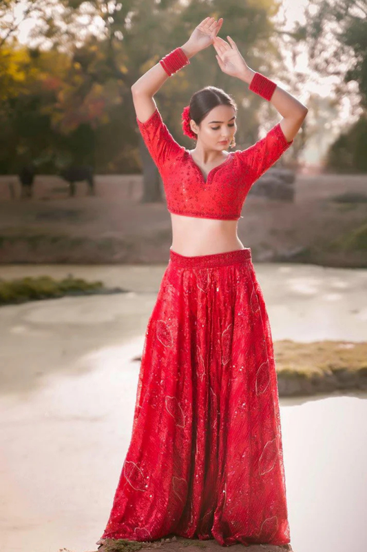 The Anarkali silhouette is the epitome of grace and charm. This handcrafted masterpiece features a flared floor-length gown with a fitted bodice that accentuates your curves and creates a stunning hourglass shape. The delicate embroidery, intricate sequin work, and exquisite bead embellishments on the Anarkali add a touch of opulence and glamour, making you feel like a true royalty.