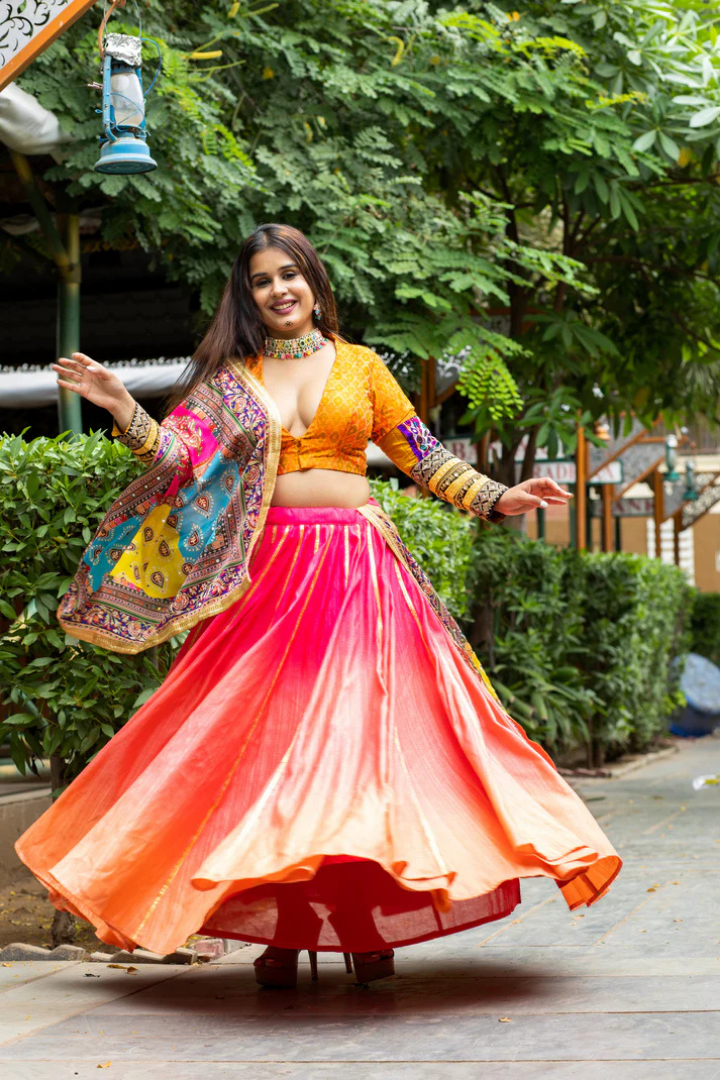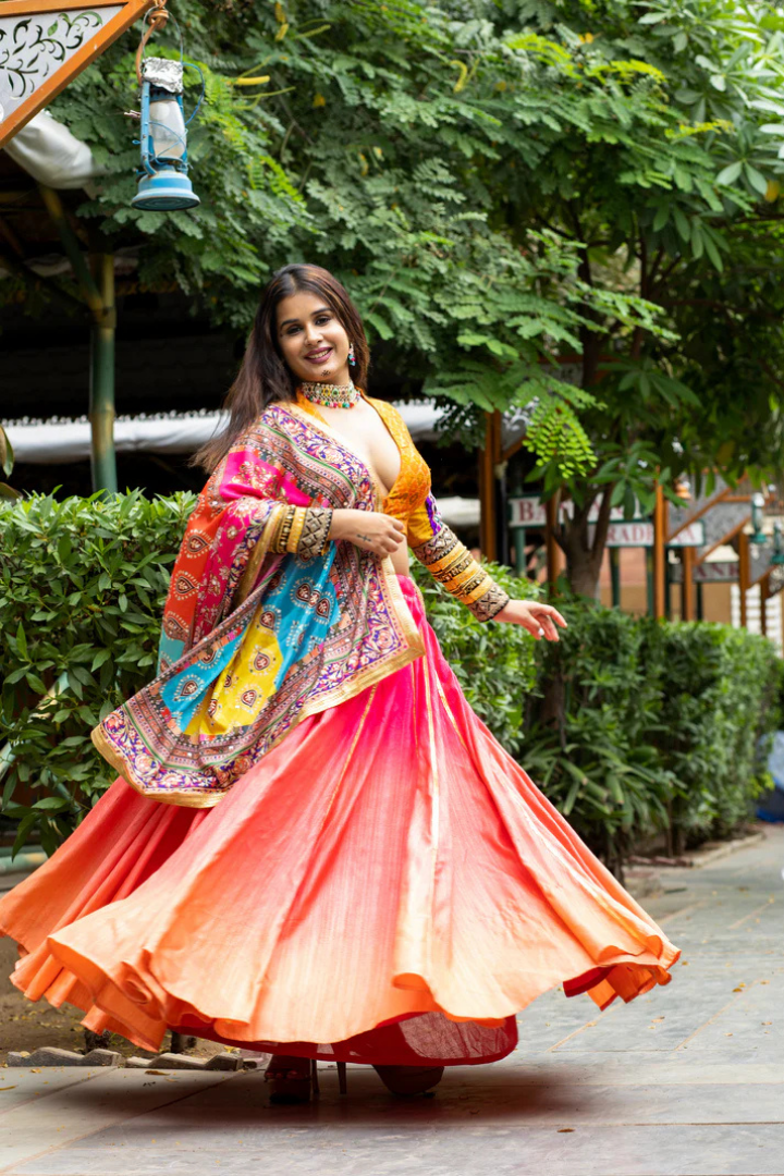 Designer Silk Lehenga Set: Shaded Elegance, Ikat Blouse, Vibrant Dupatta