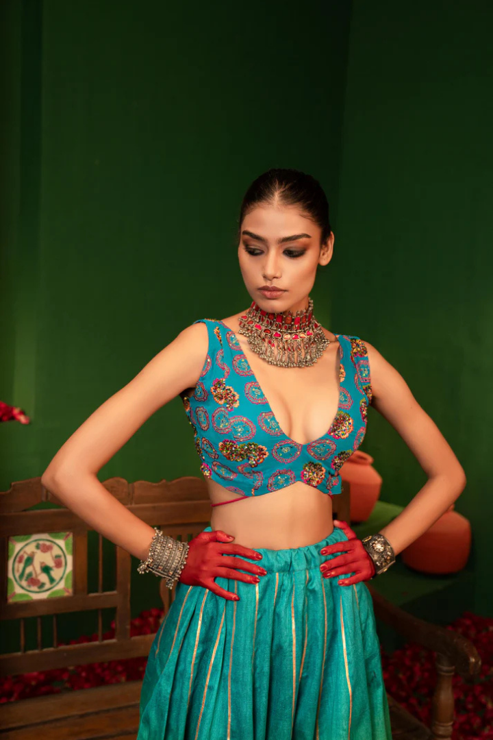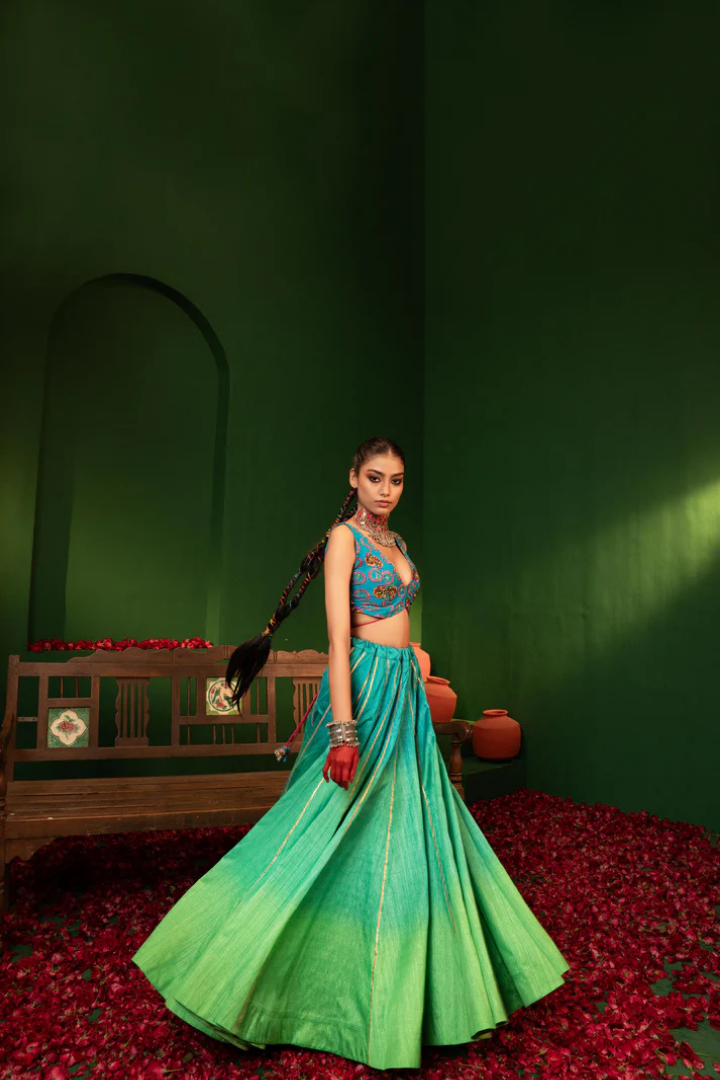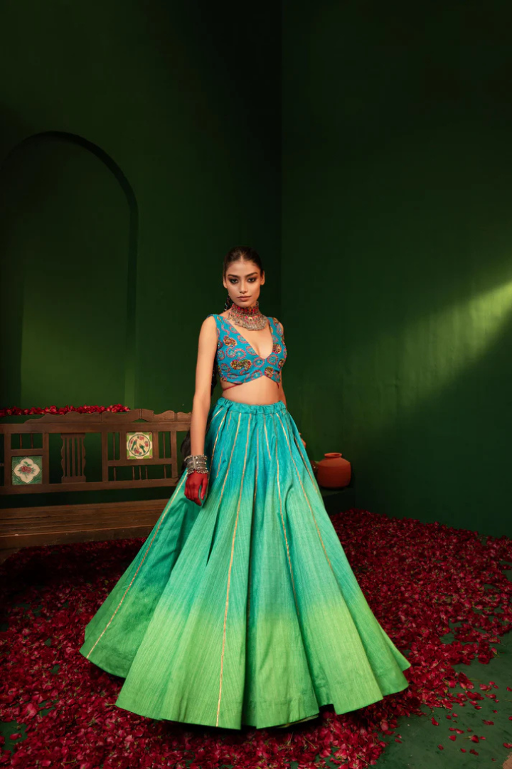 Devi Arctic Blue Lehenga in Raw Silk, Georgette & Crepe