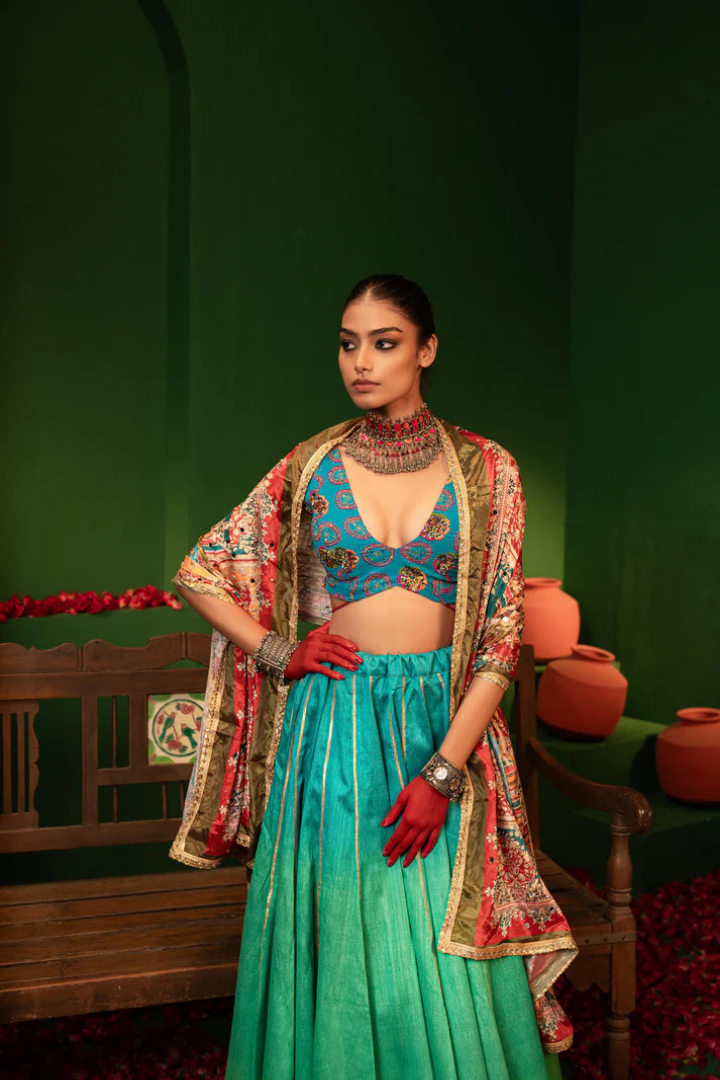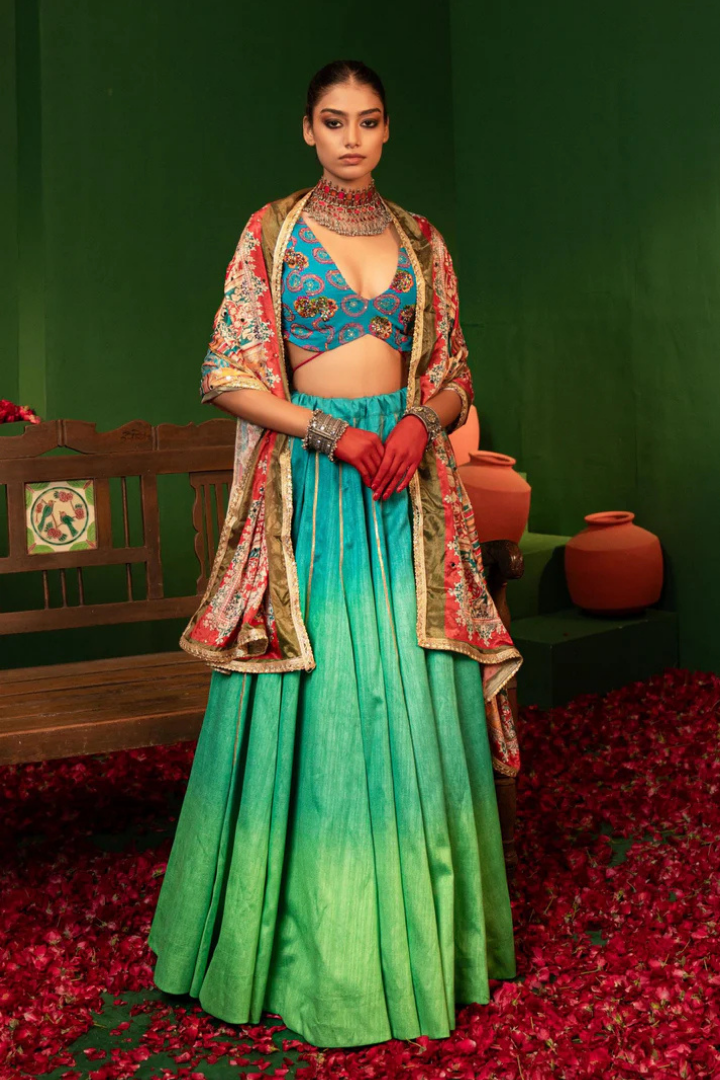 Cool and elegant, this Devi Arctic Blue lehenga combines the richness of raw silk with the fluidity of georgette and crepe. The unique color and fabric blend create a sophisticated ensemble perfect for modern brides and wedding guests alike.