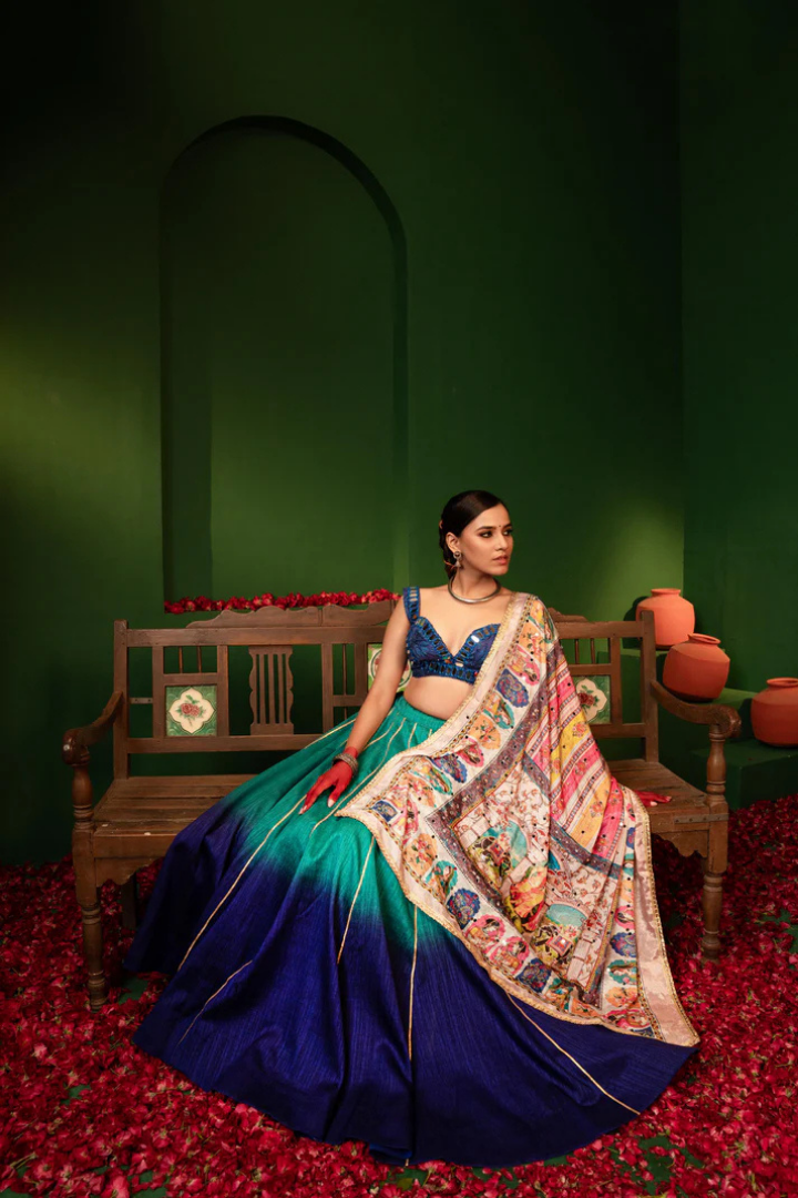 Embody the beauty of clear skies with this Devi Azure Silk lehenga. Made from a combination of raw silk and crepe, this ensemble offers a perfect balance of structure and fluidity, making it an ideal choice for various festive occasions.