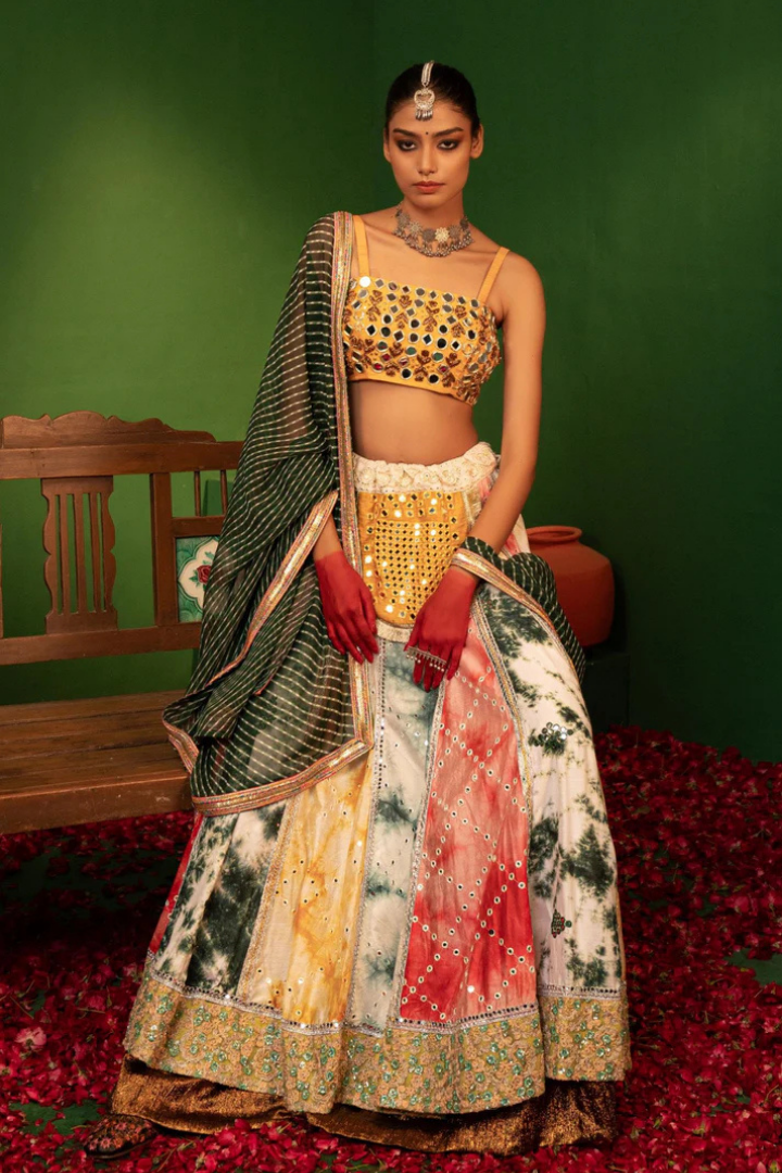 Embrace the playful spirit of Leela with this colorful Chanderi silk lehenga set. The ensemble features a vibrant multi-colored lehenga paired with an intricately designed mirror work blouse. This combination of colors and textures creates a joyful and sophisticated look for any festive occasion.