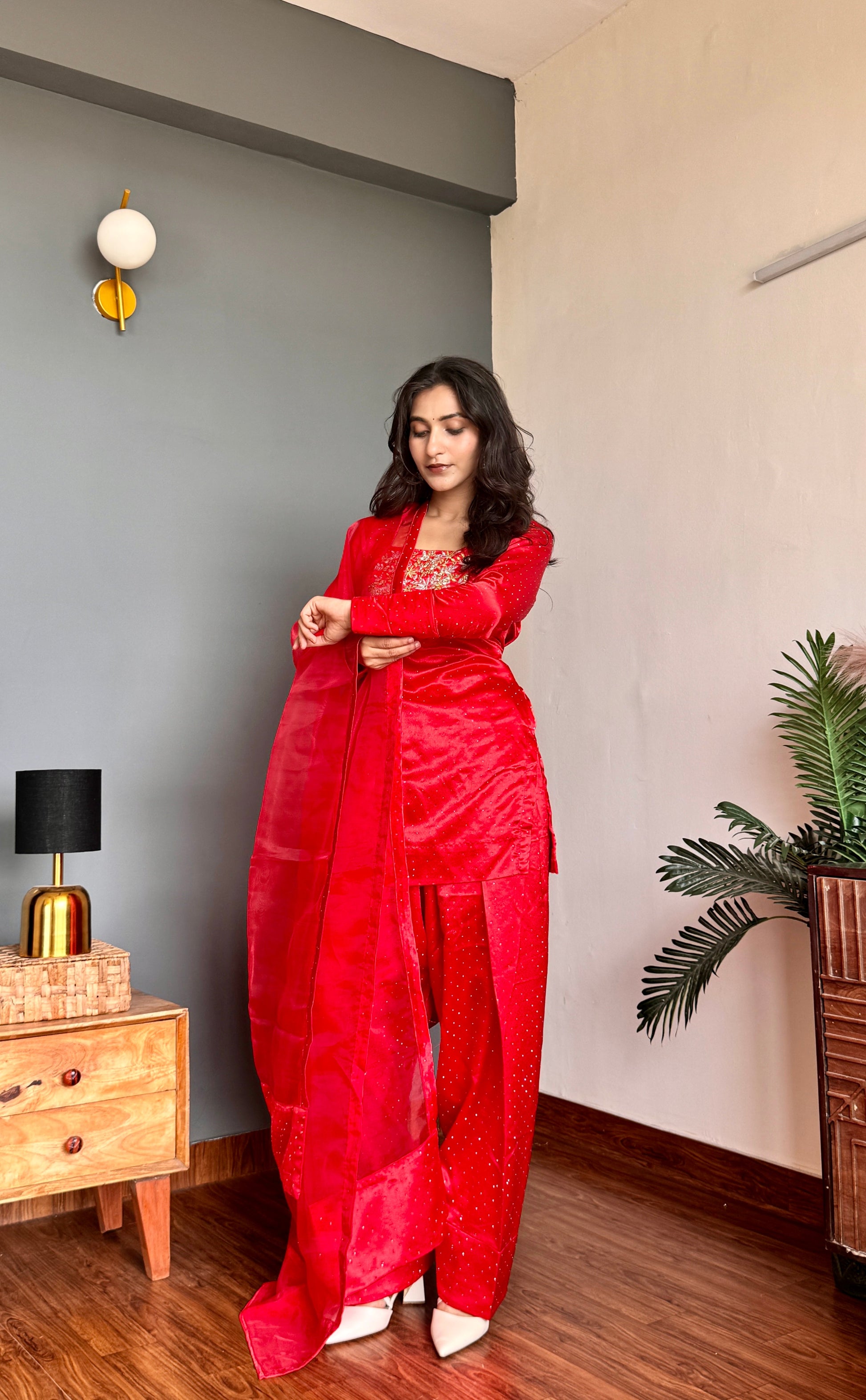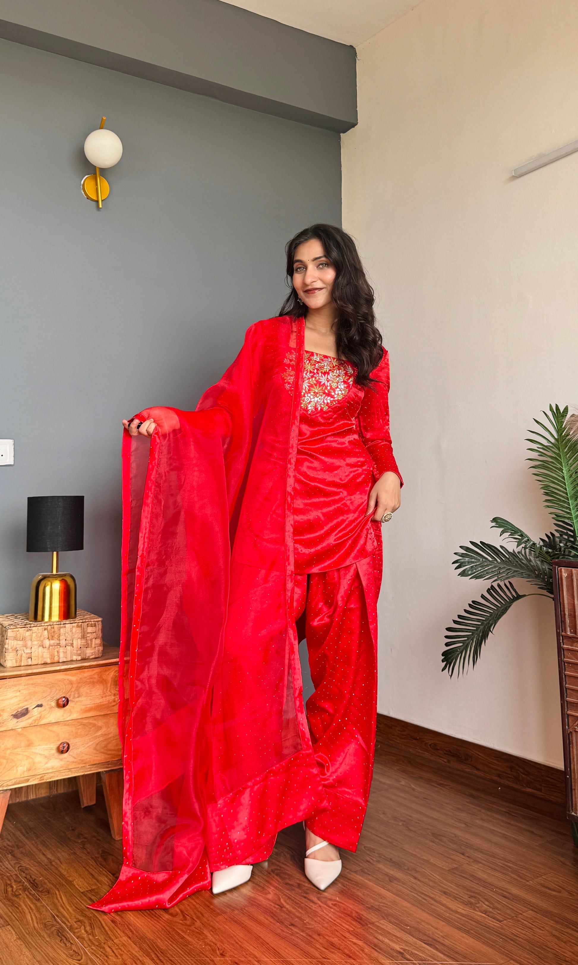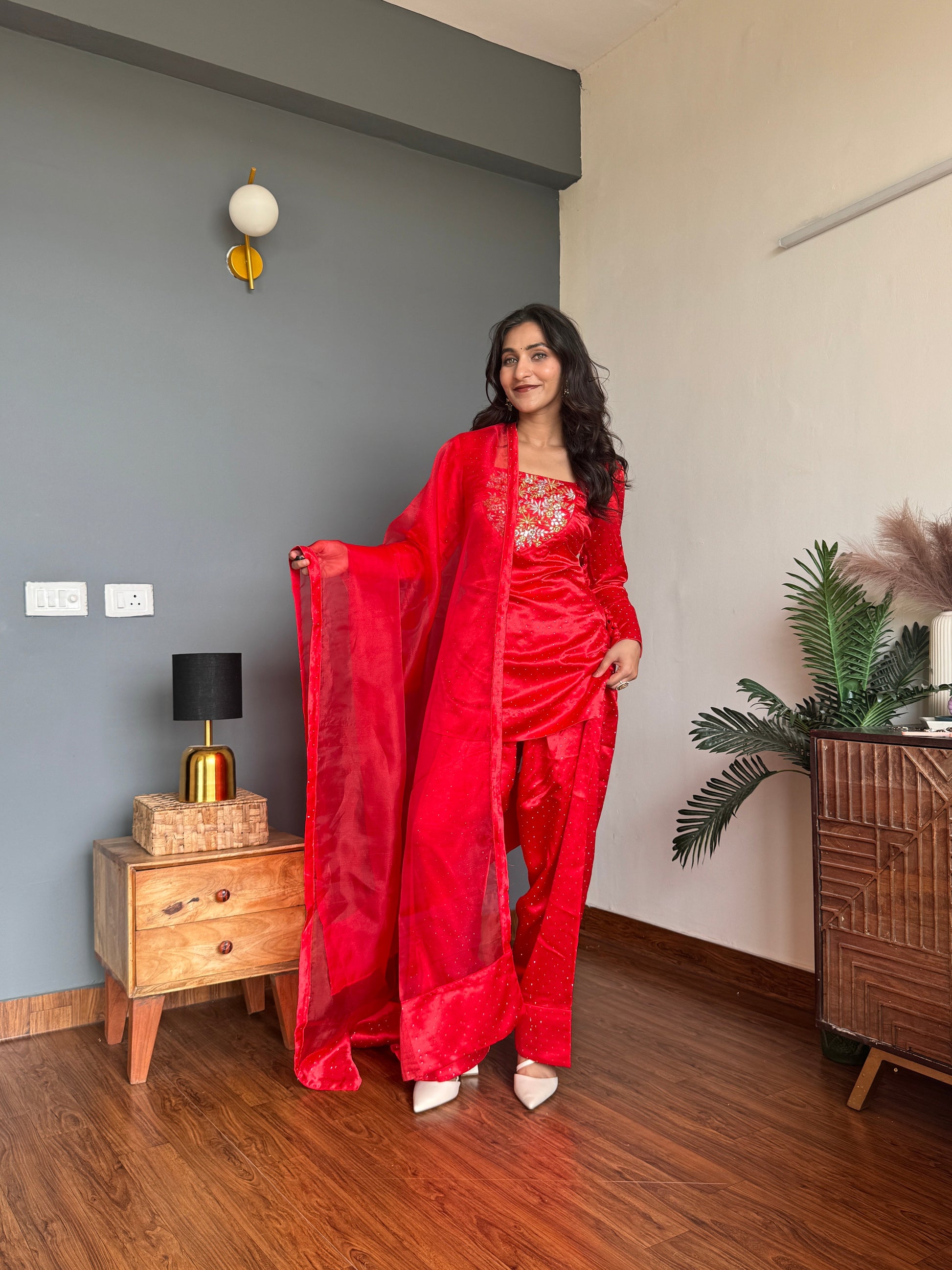 The Dua Farsi Salwar Set is a red outfit made from soft Jimichoo fabric. It includes a top, pants, and a matching dupatta. The top has a straight cut with a round neckline. The pants are wide and comfortable. The dupatta adds a finishing touch to the set.