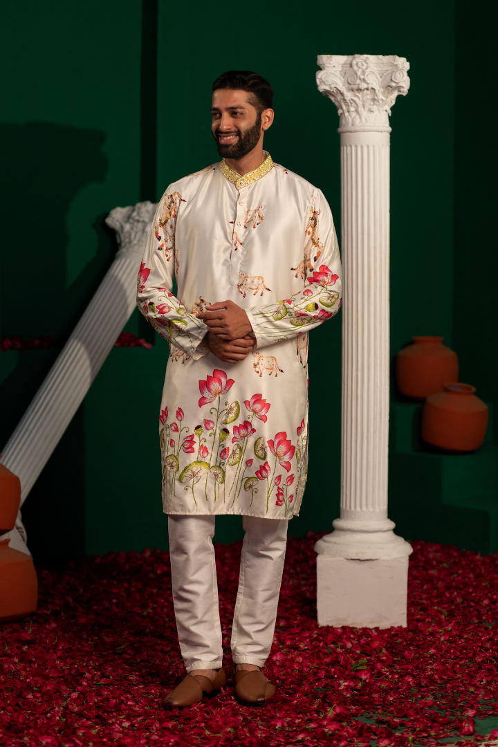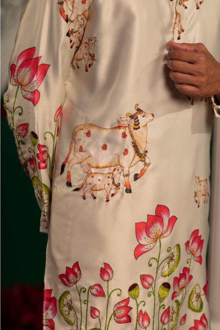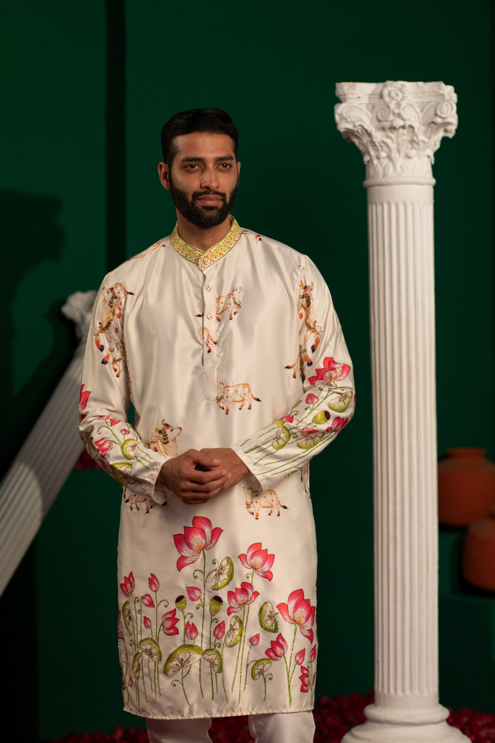Embrace elegance with this cream-colored kurta, inspired by the harmony of nature. The pristine base is adorned with intricate embroidery, showcasing blooming lotus flowers and charming cattle motifs.