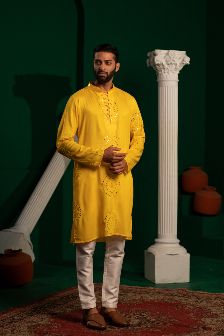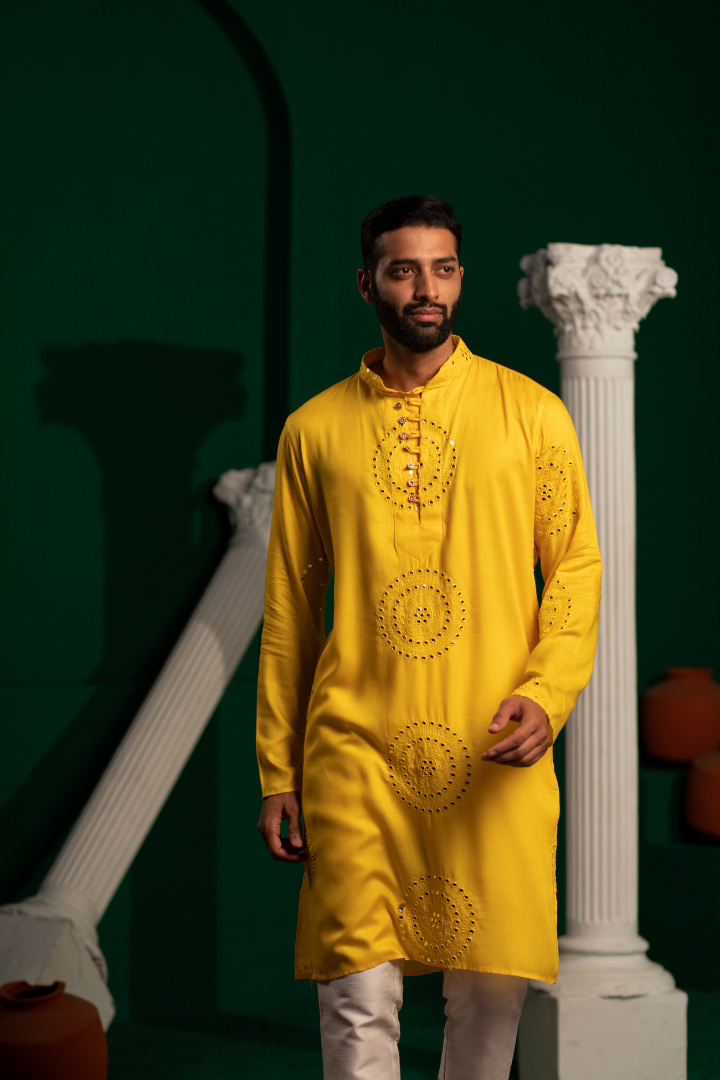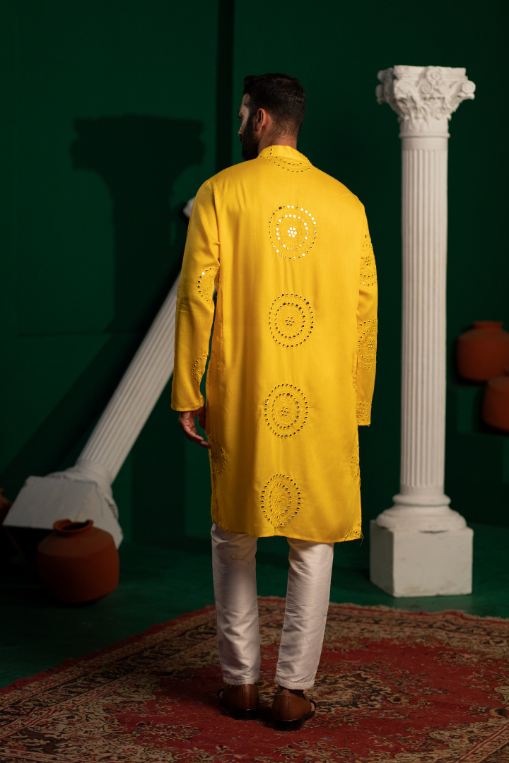- A radiant kurta with gold foil work and mirror details on soft rayon cotton. The design creates a mesmerizing play of light.