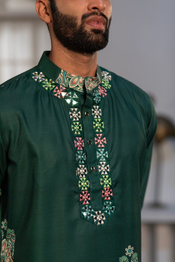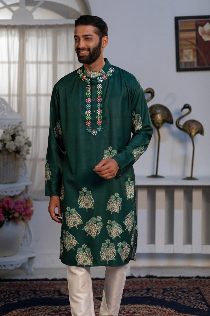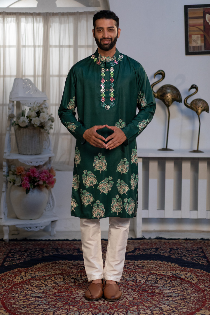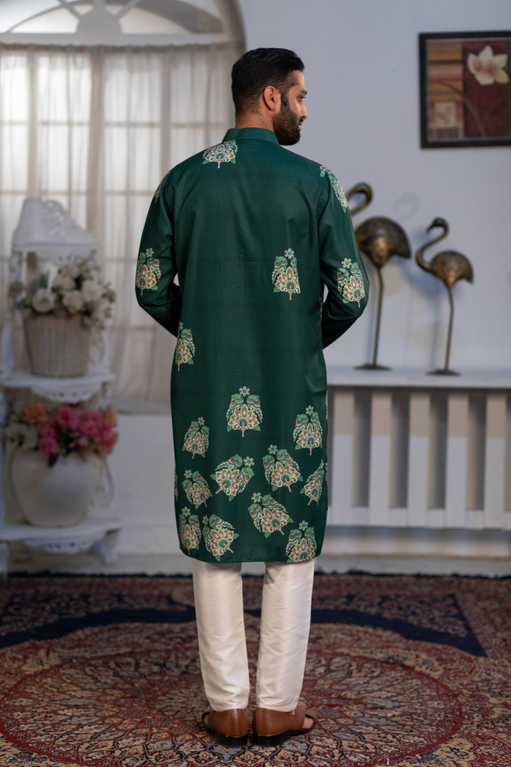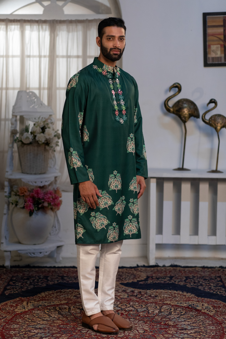 A sophisticated kurta featuring digital sparrow prints on forest green silk blend. The design combines nature-inspired motifs with modern printing.