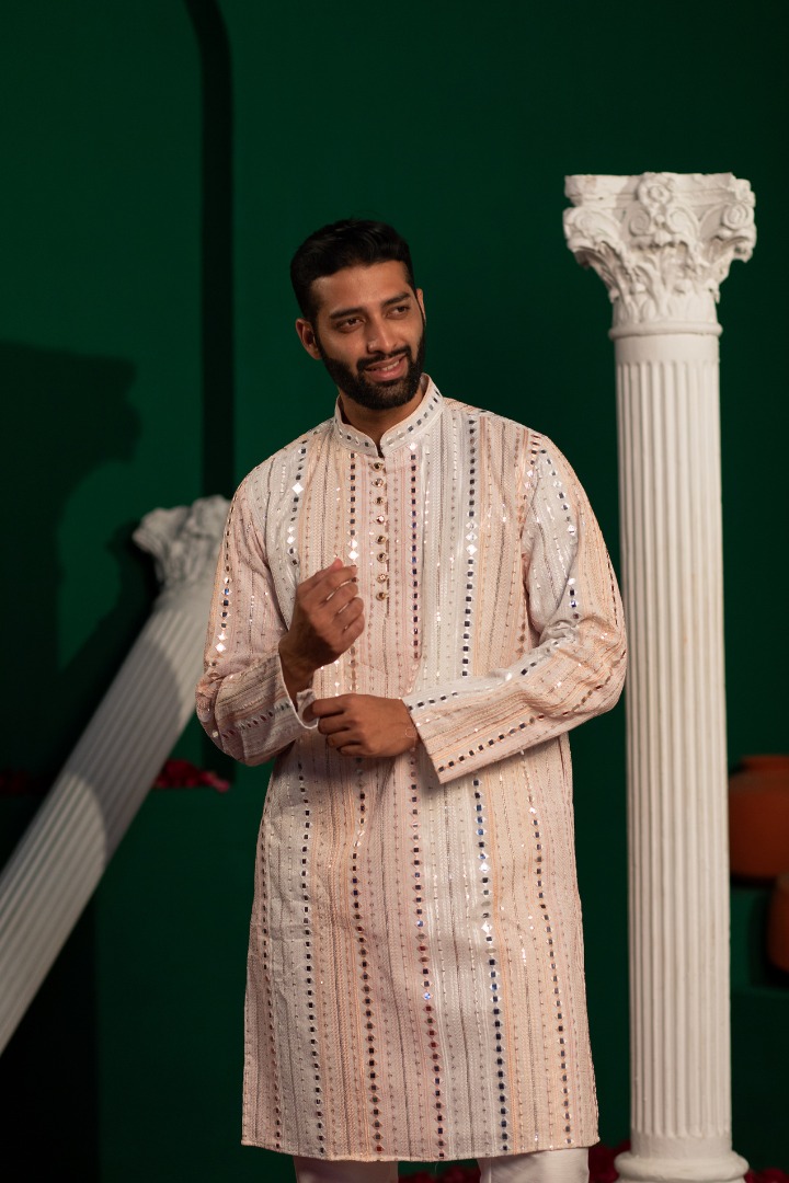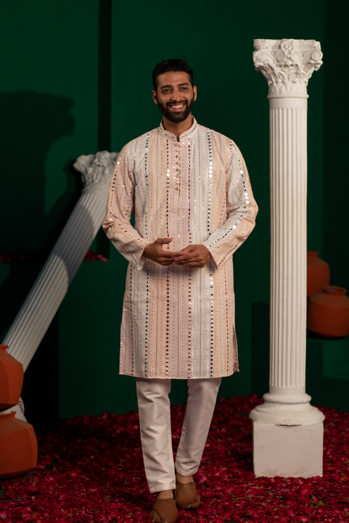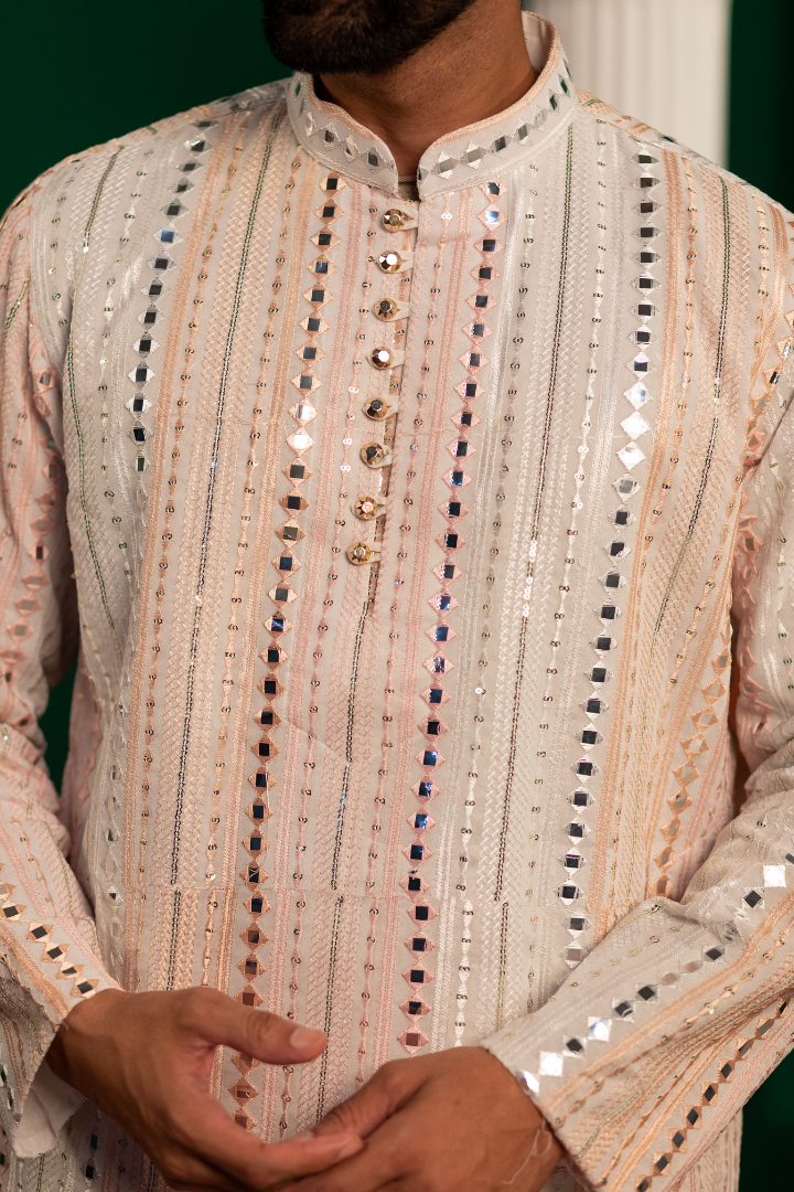 A delicate georgette kurta combining sequins, foil prints, and mirror work. The frost peach shade creates a soft, elegant look.