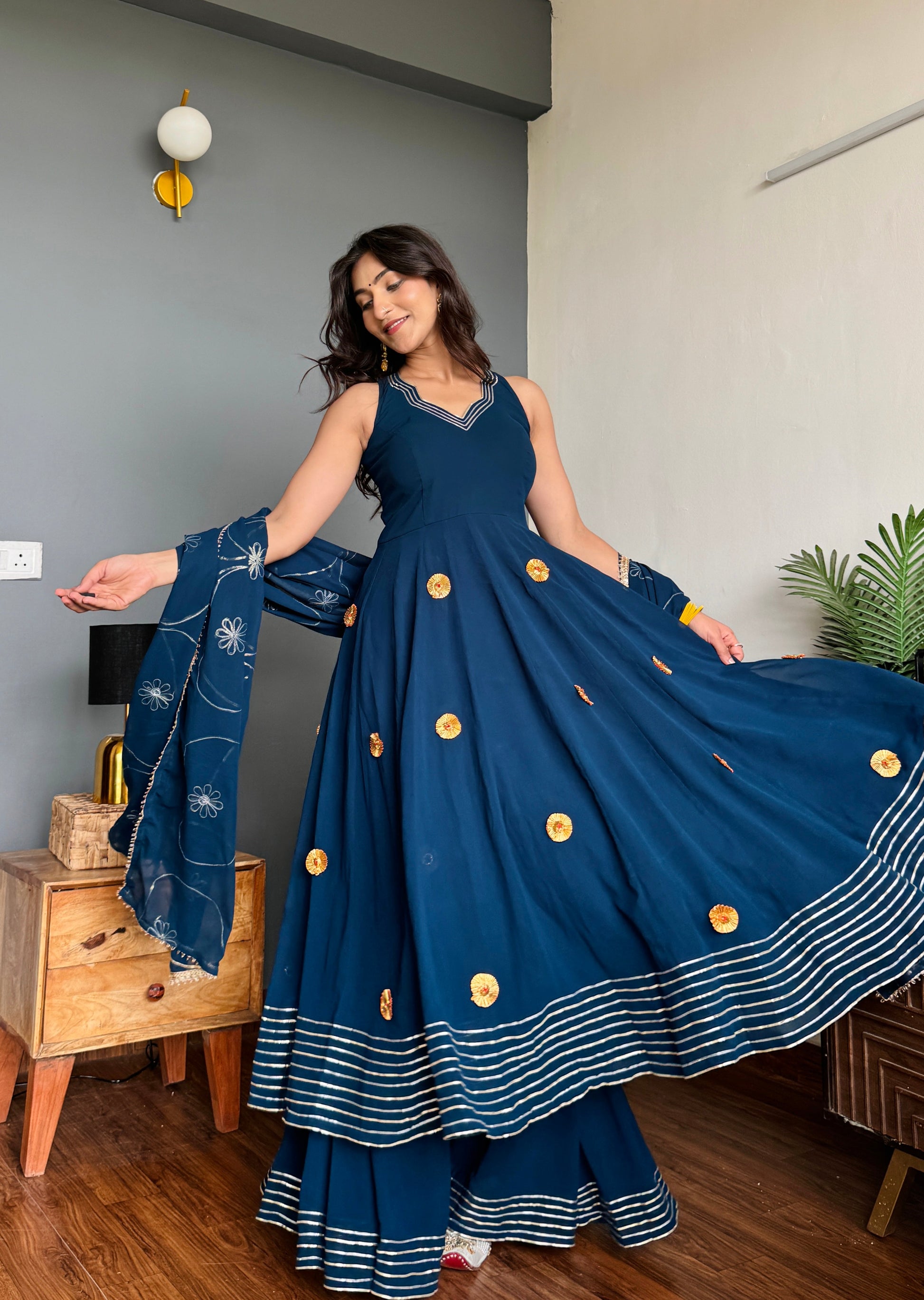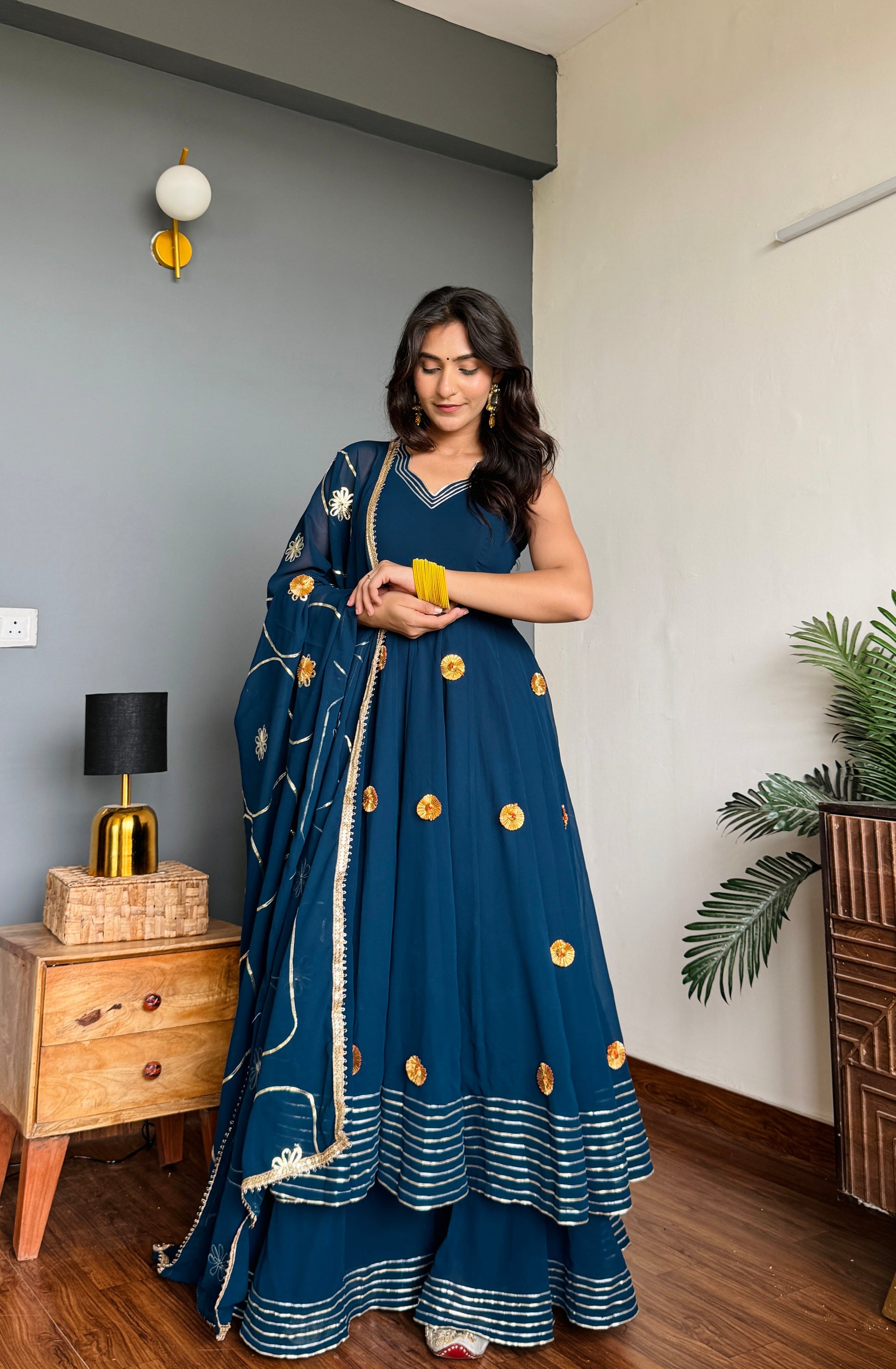 Fusionic Blue Floral Gota Work is made of cotton. It has blue floral patterns with gota work that shines. The fabric is breathable. The cut lets it hang well and gives ease of movement. Easy on the skin and fine for long wear. Best for casual weddings, family events, or festivals. Match with flats or sandals.