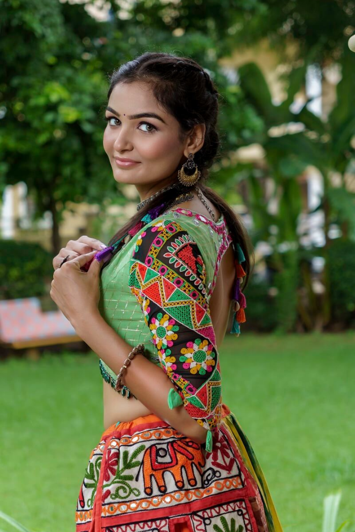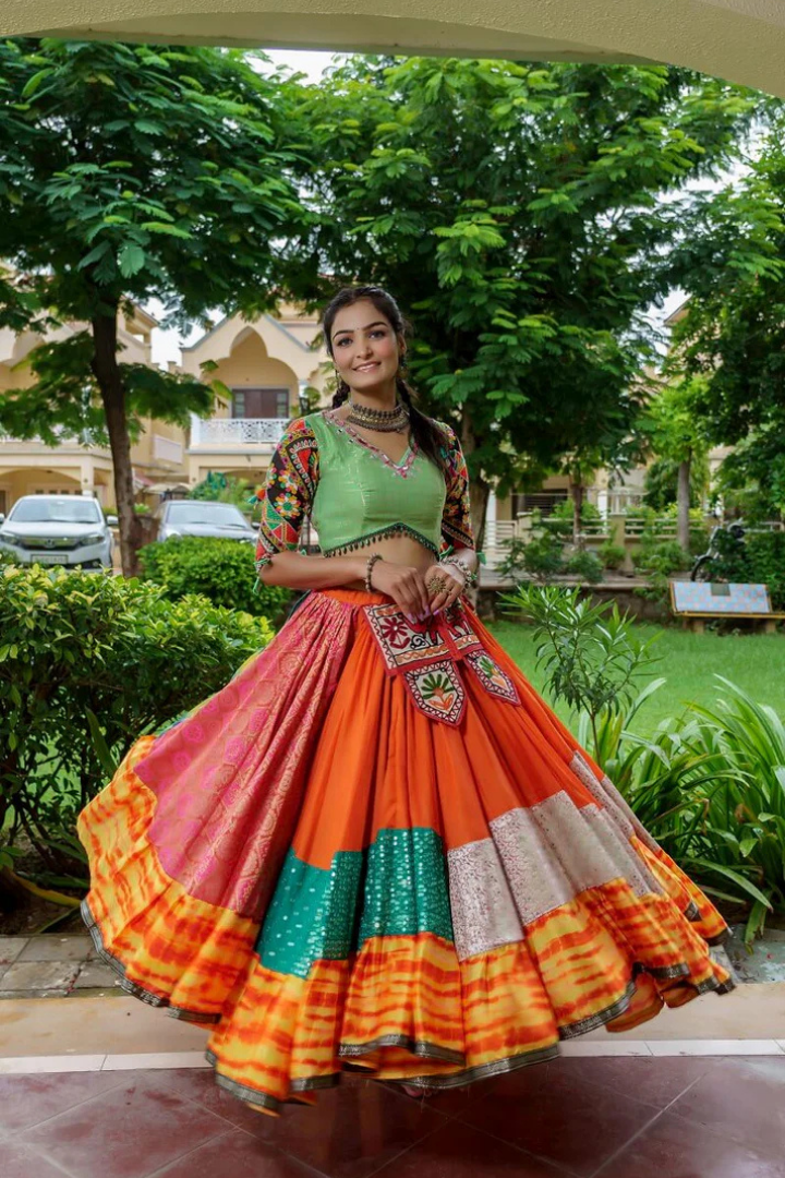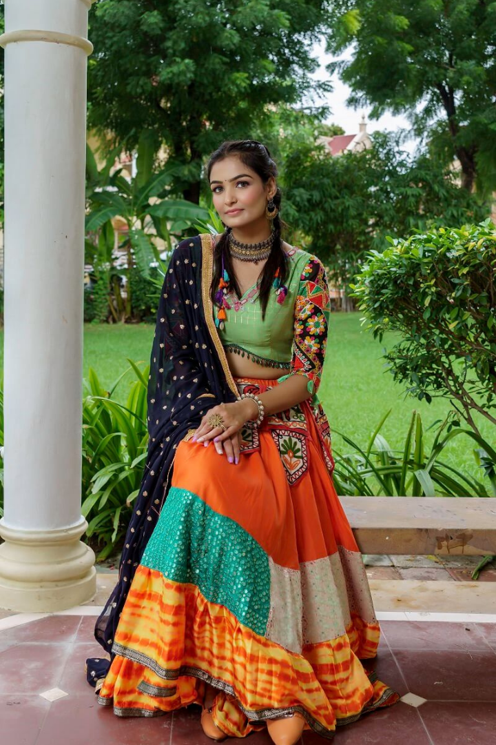 Green Blouse And Multicolour Lehenga With Navy Blue Dupatta