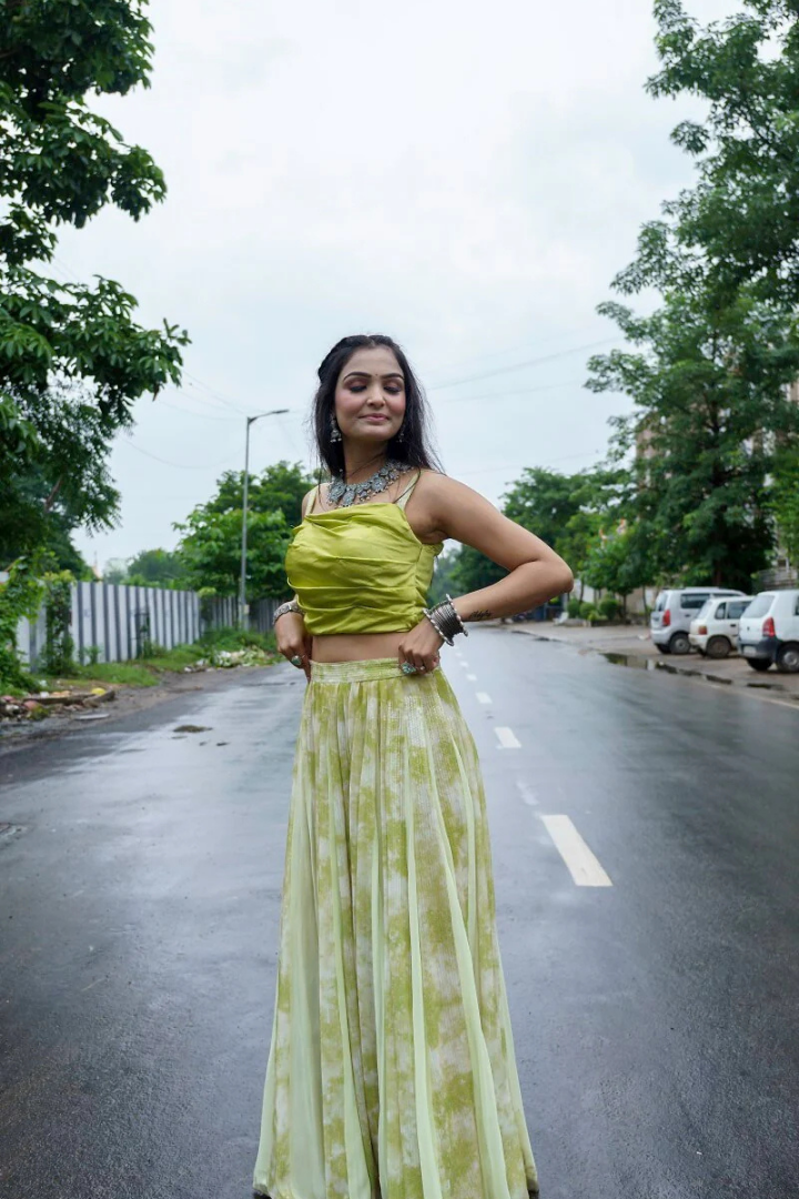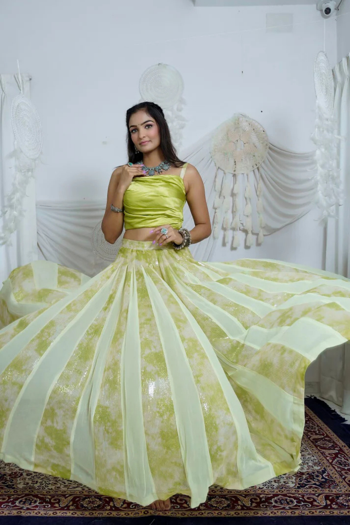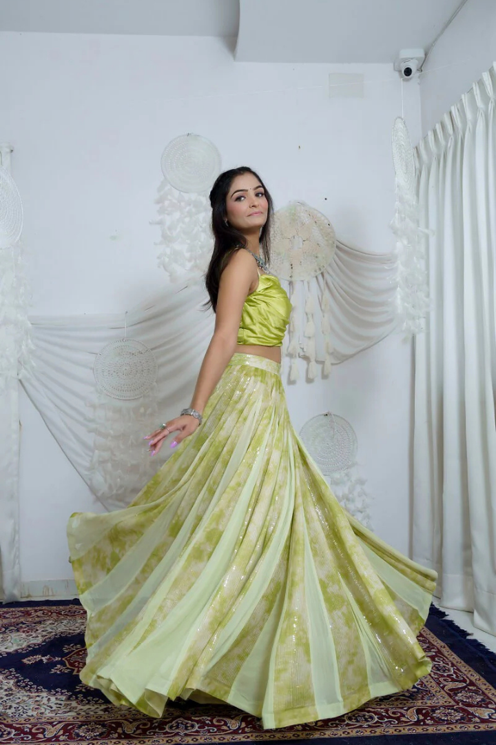 Custom-made printed sequence lehenga. This attire is enhanced with a sequence worked allover. Available with a sleeveless blouse. The choli length is 14 and can be done long according to your requirement. (Slight variation in actual color vs. image is possible. All sizes available)