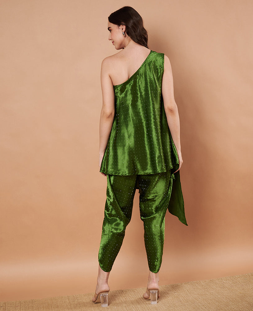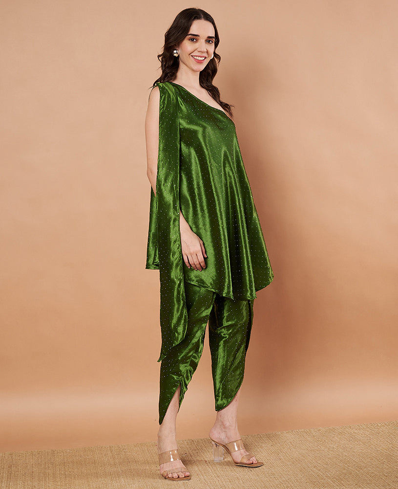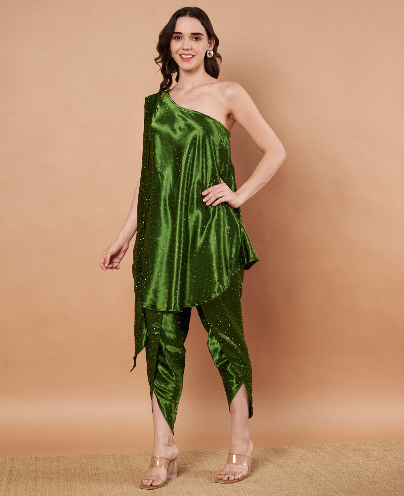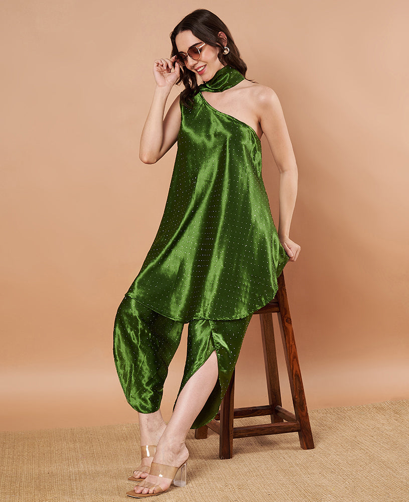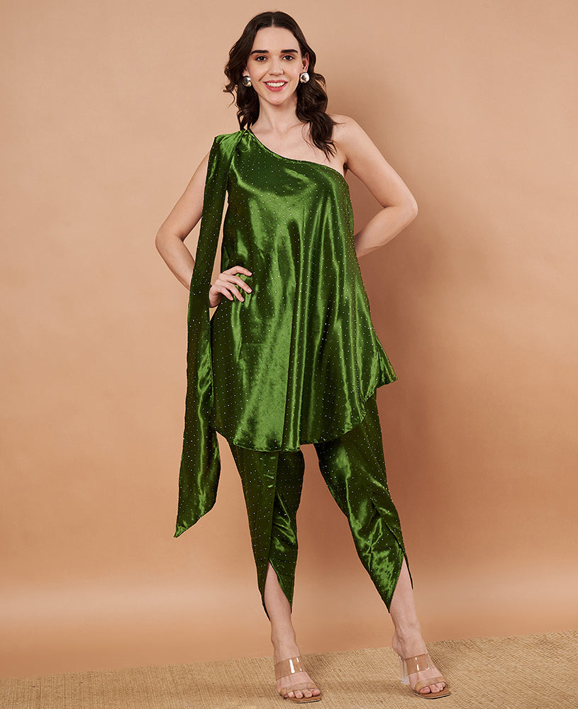 The Green Siroski Cord Set has a matching top and bottom in satin fabric. It has siroski embellishments that add shine. The fabric feels smooth and soft. The fit is relaxed, so you can move easily. The green colour looks nice without being too loud. You can wear it for casual days, family visits, or small gatherings. Pair with flats or simple sandals. Just small jewellery is enough to finish the look.