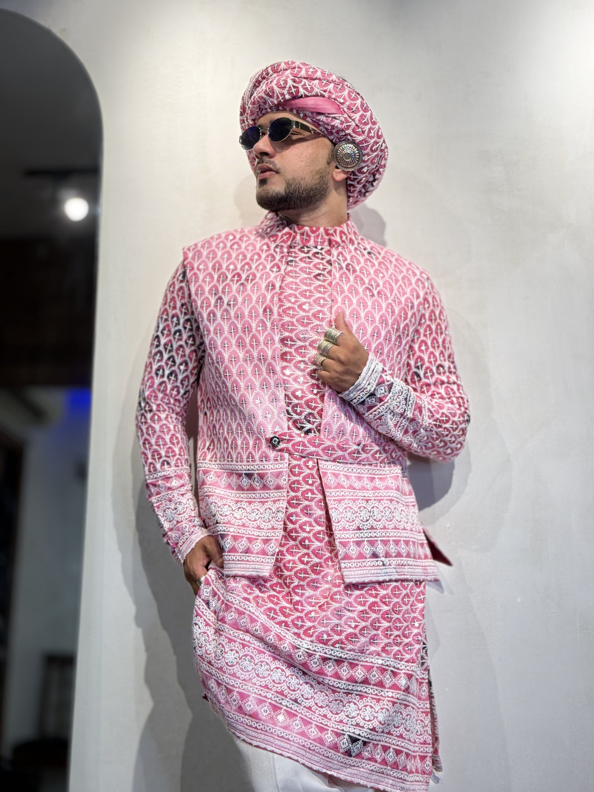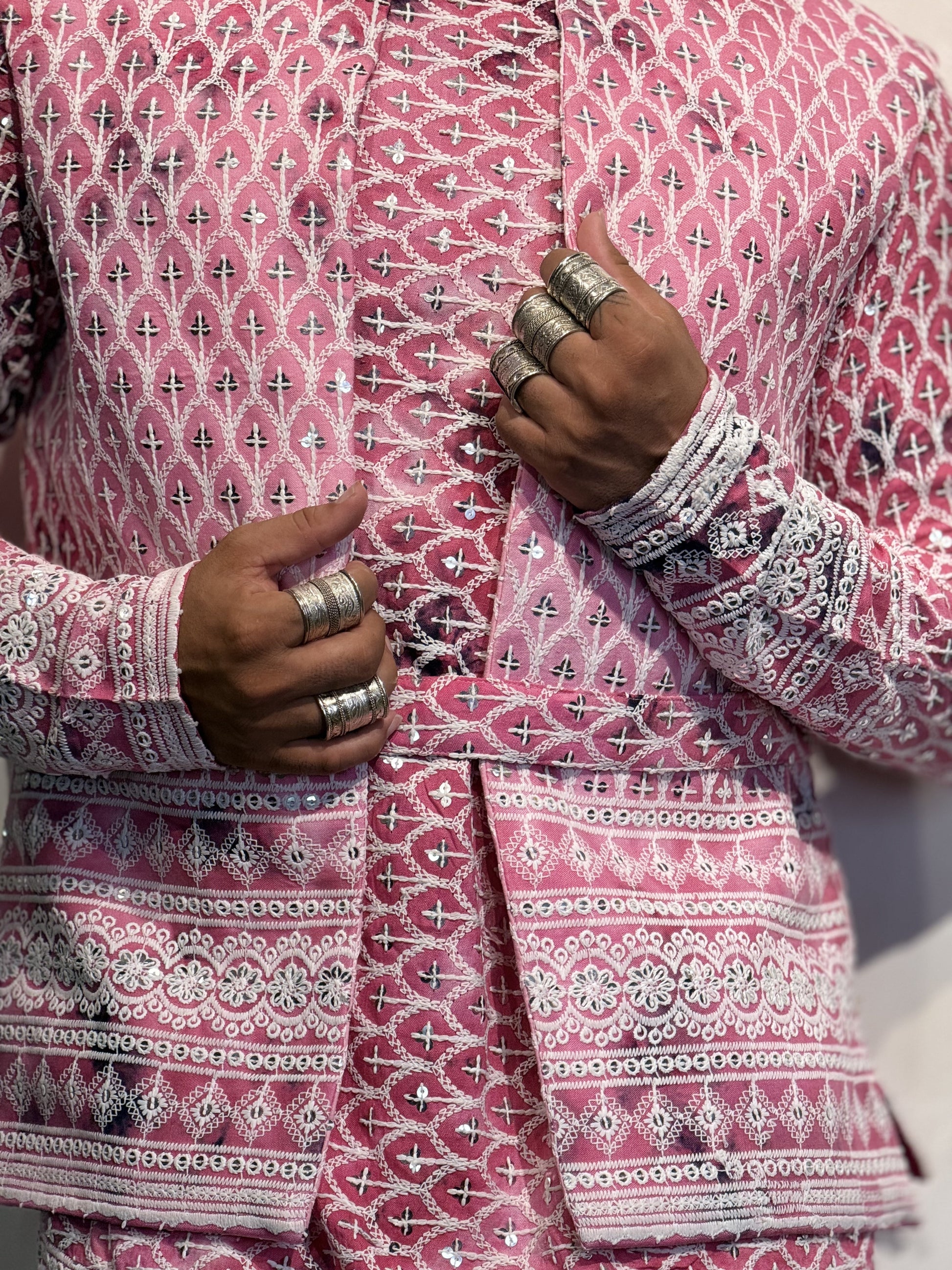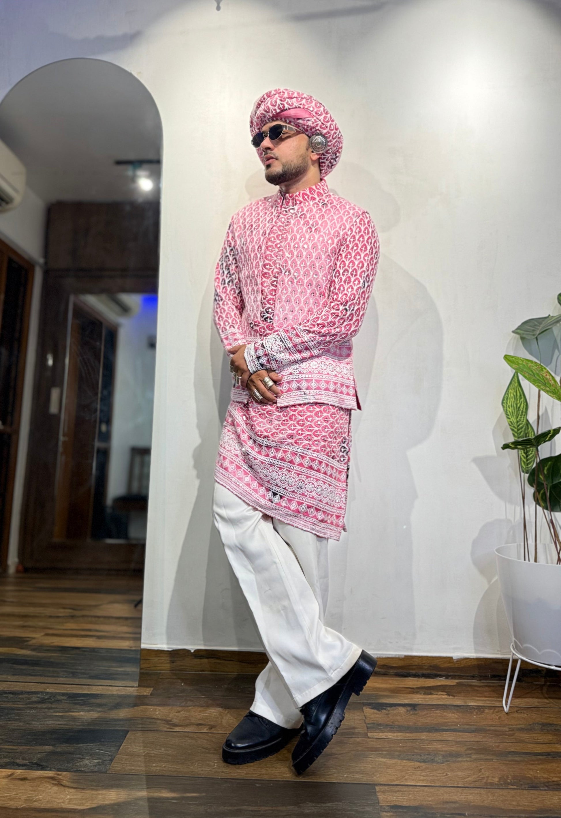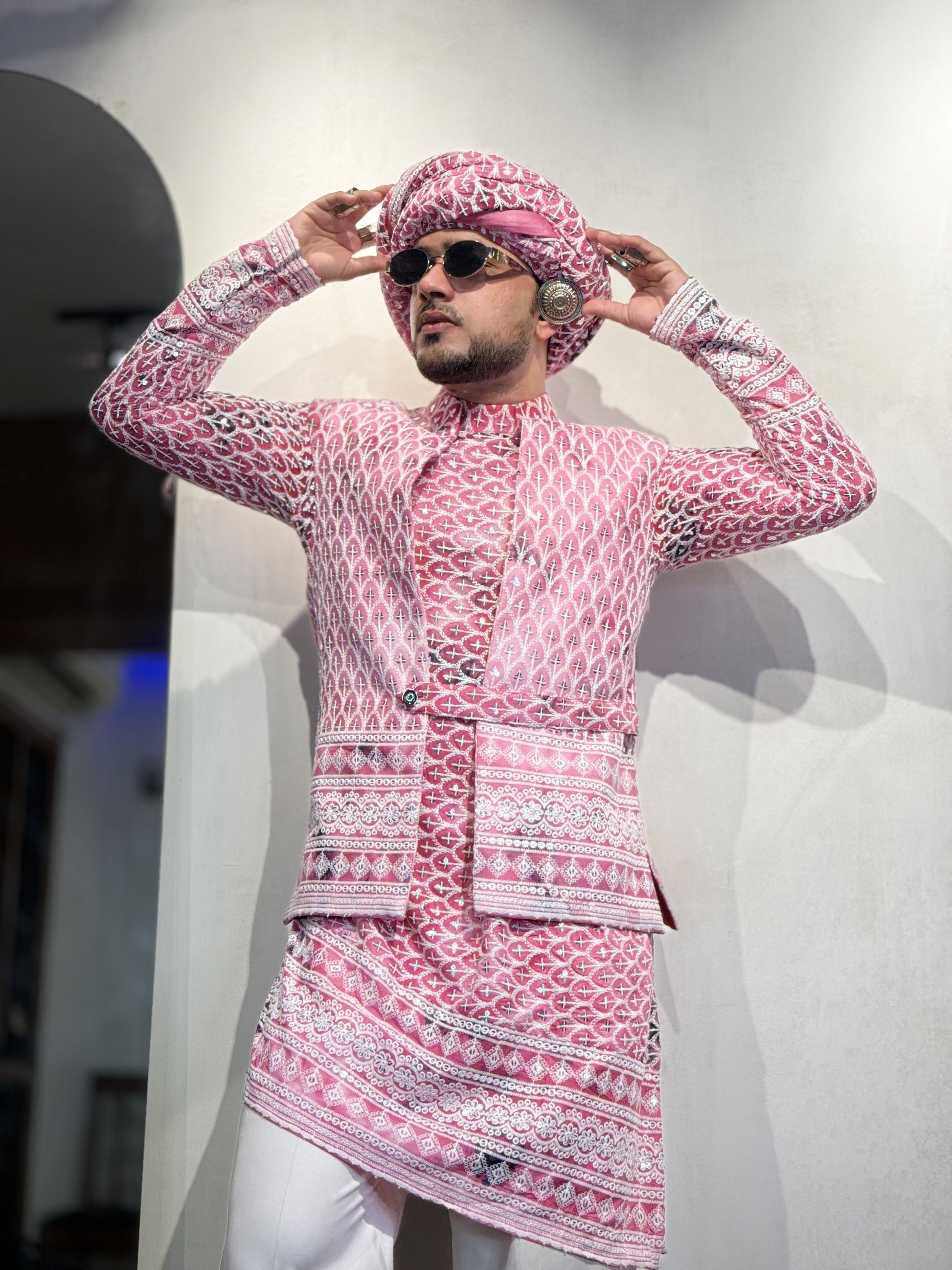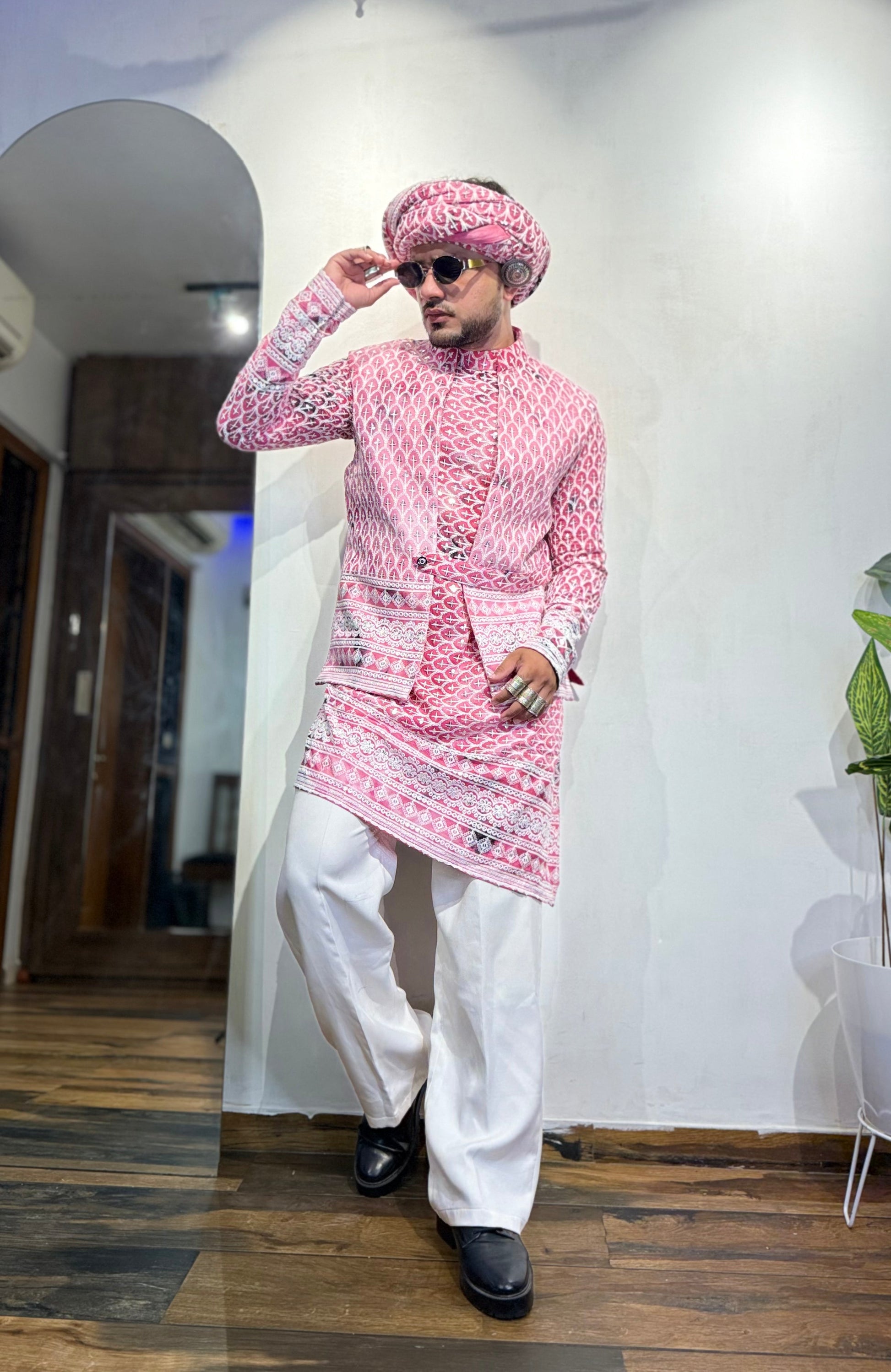 Gulabi Pink Koti Kurta is a matching set with a straight-cut kurta and a jacket (koti) on top. The kurta is simple and comfortable. The jacket adds a neat layer. The cotton is soft and feels good to wear.