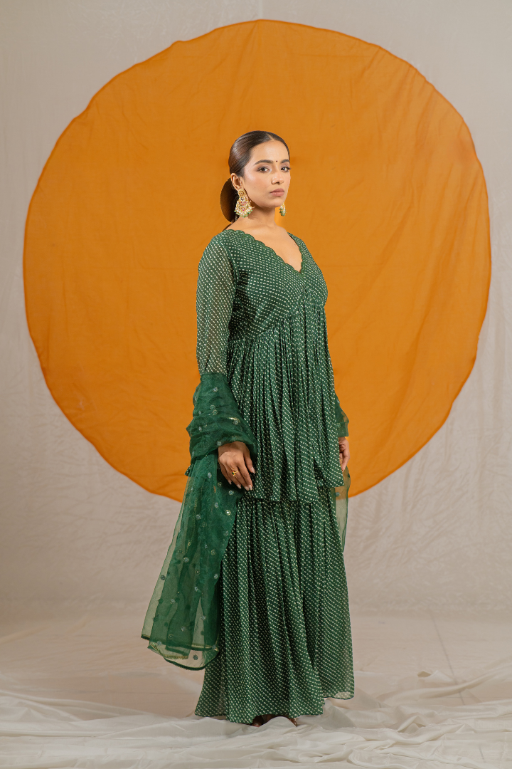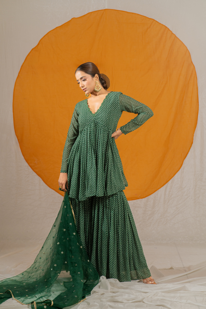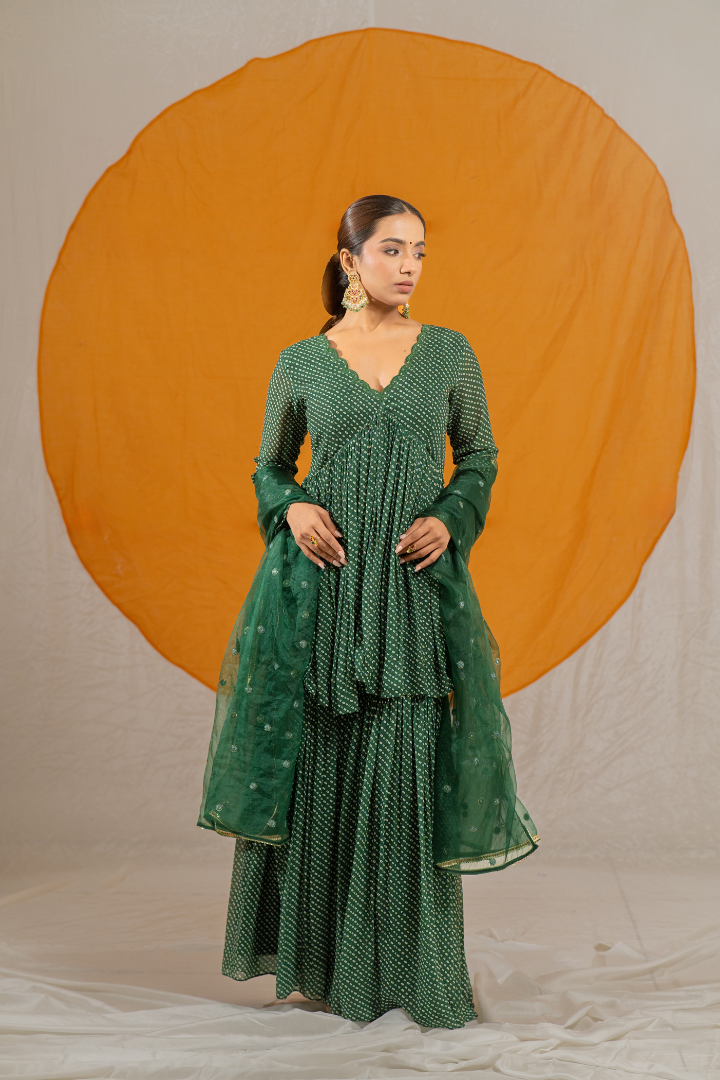 Hare Wala Bhandej Kurta and Sharara with Organza Embroidery Dupatta
