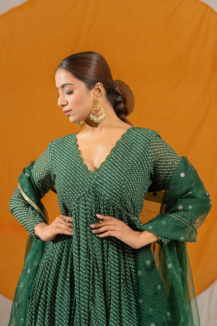 Elevate your ethnic wardrobe with this exquisite Hare Wala Bhandej Kurta and Sharara set, paired with a stunning Organza Embroidery Dupatta. The kurta features traditional Bhandej (Bandhani) print, showcasing the intricate art of tie-dye that adds a touch of elegance and cultural heritage. The accompanying sharara offers a perfect blend of comfort and style, with its wide-leg design ensuring a graceful silhouette.