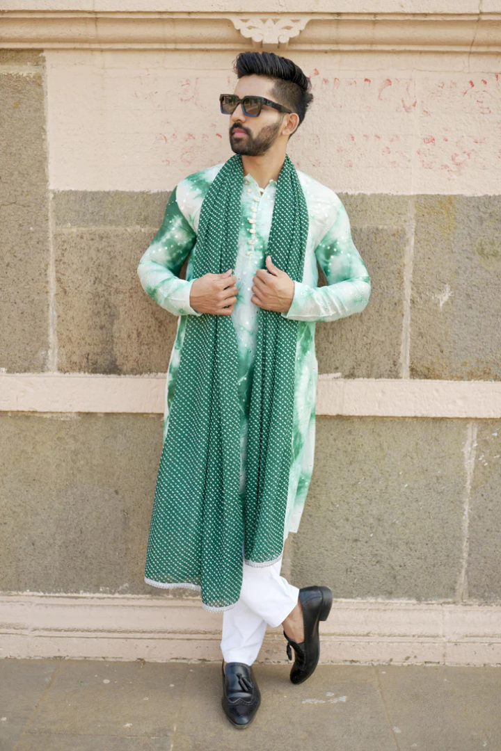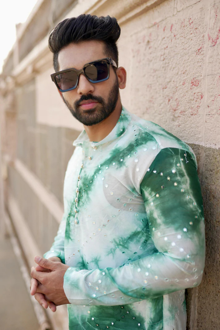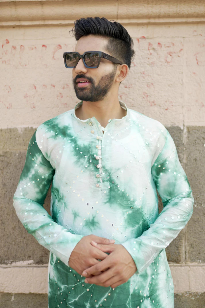 Step into the lush beauty of Haryali with our Chanderi Green Check mens mirror work kurta