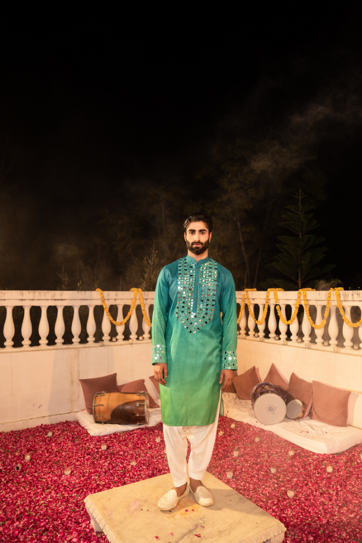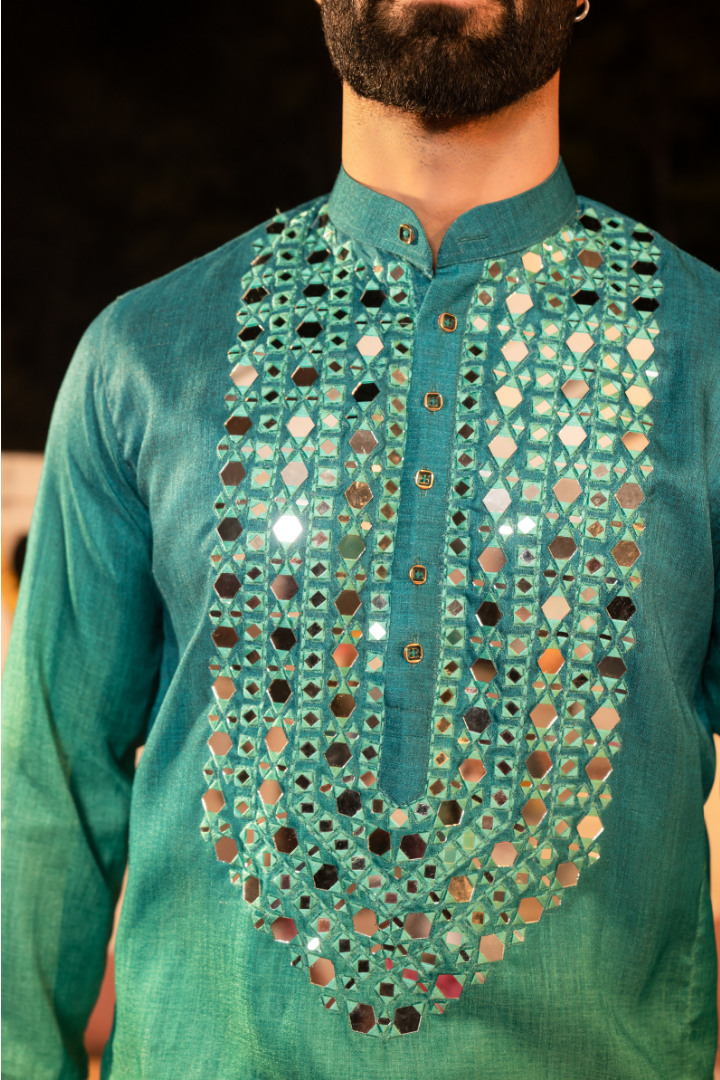 Embrace the beauty of nature with this Capri peacock-inspired mirror kurta. The stunning blend of blues and greens evokes the iridescent plumage of a peacock, while the mirror embellishments add an extra layer of shimmer and sophistication.
