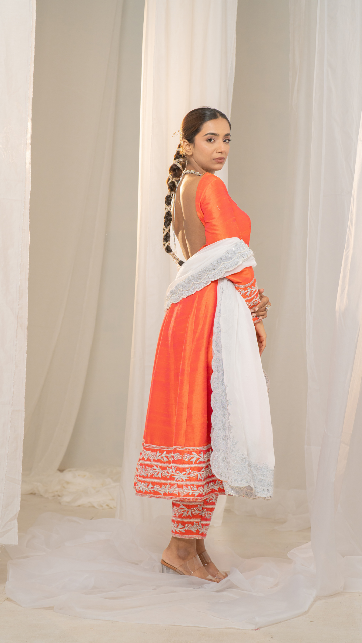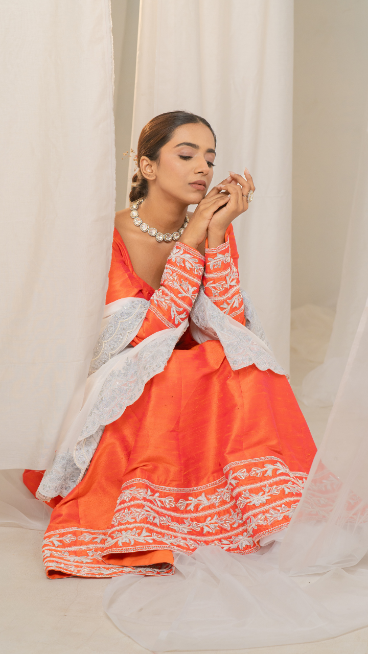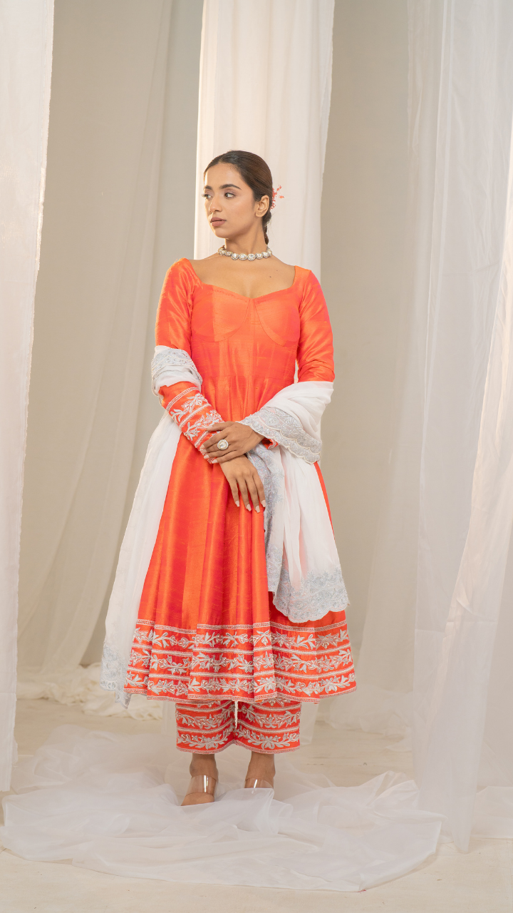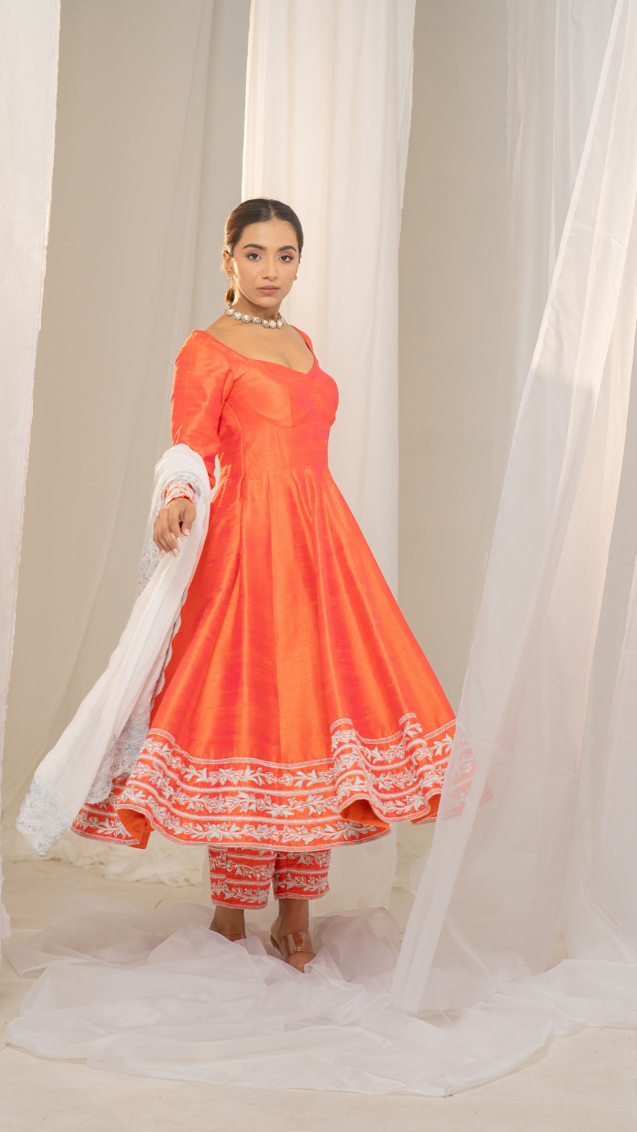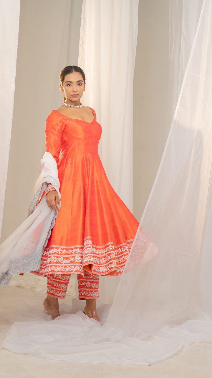 Kesar-Pista Orange Raw Silk Anarkali with White Embroidery and Organza Dupatta
