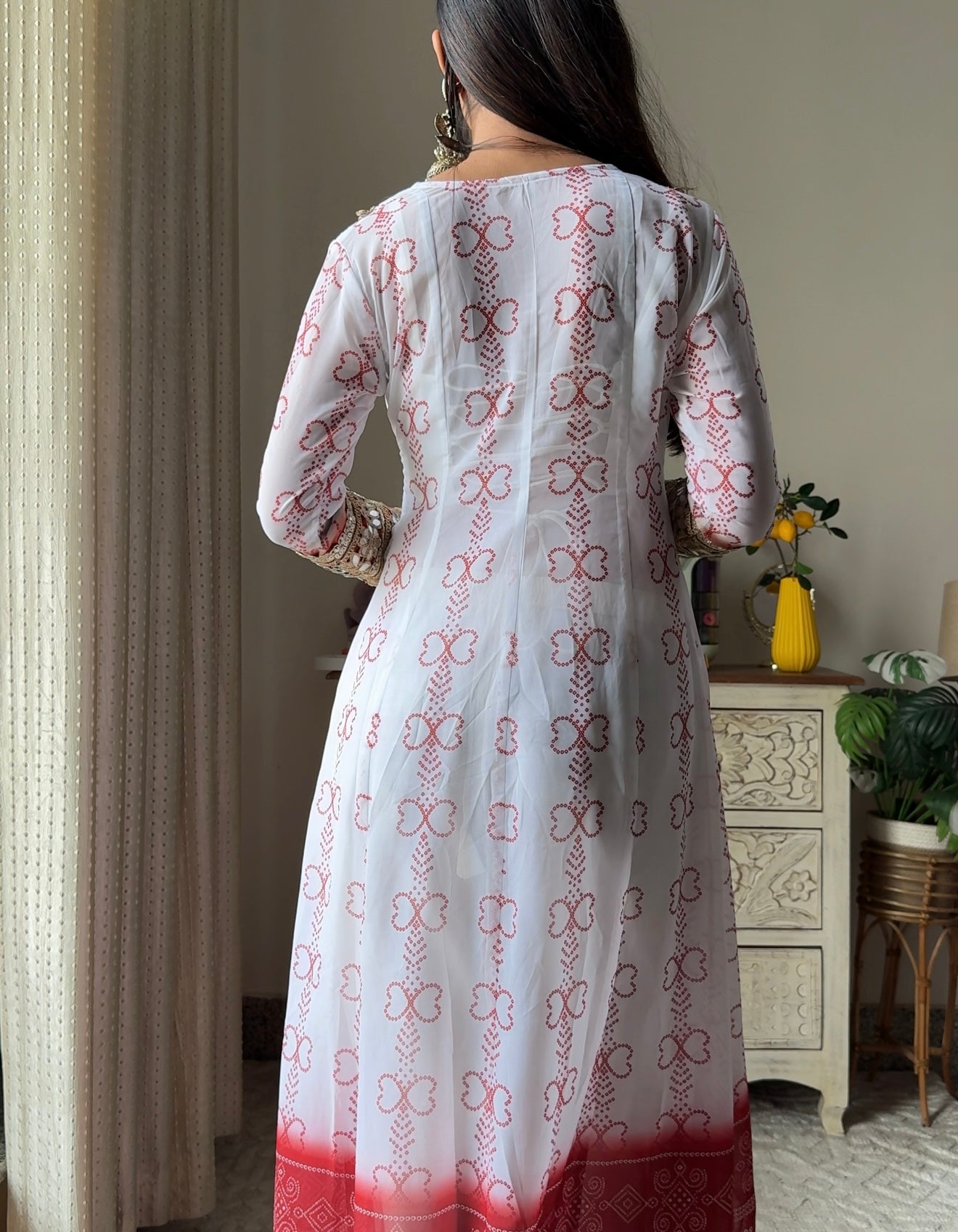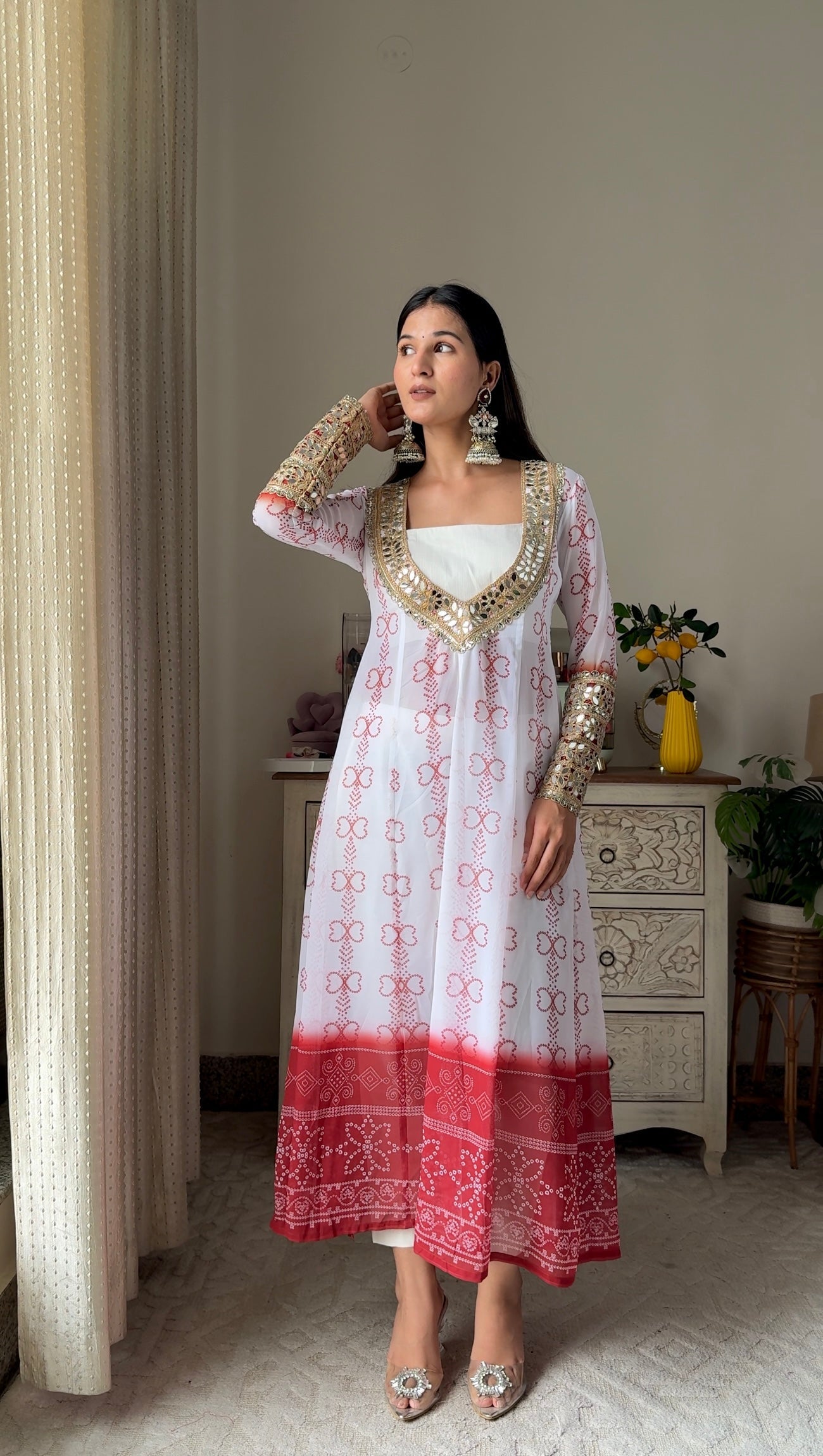 This is a white kurta with mirror work and matching pants. The fabric is georgette. The kurta has a straight cut. The mirror work adds shine. The pants are easy to move in and match the kurta. You can wear this for parties or special events.