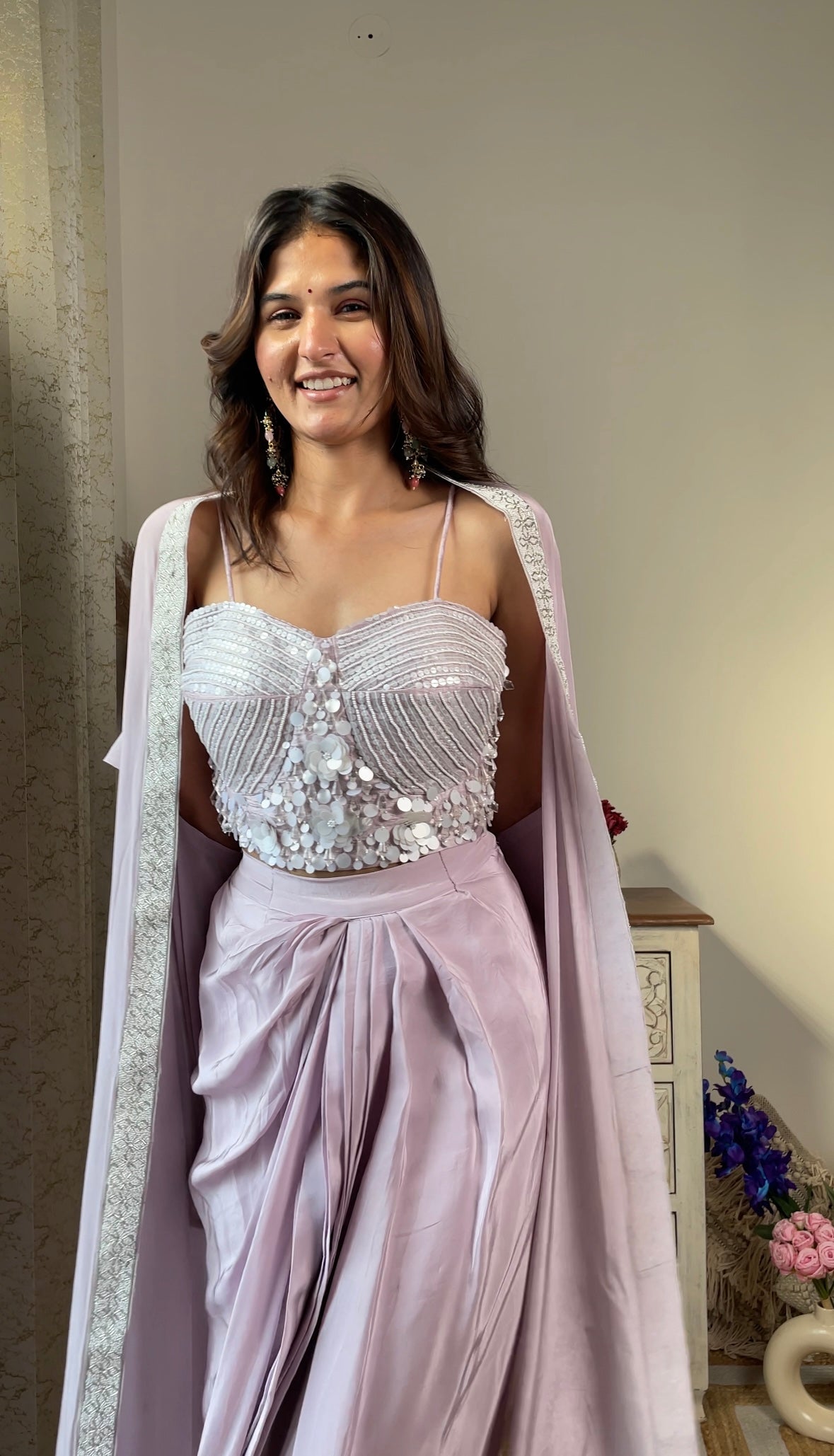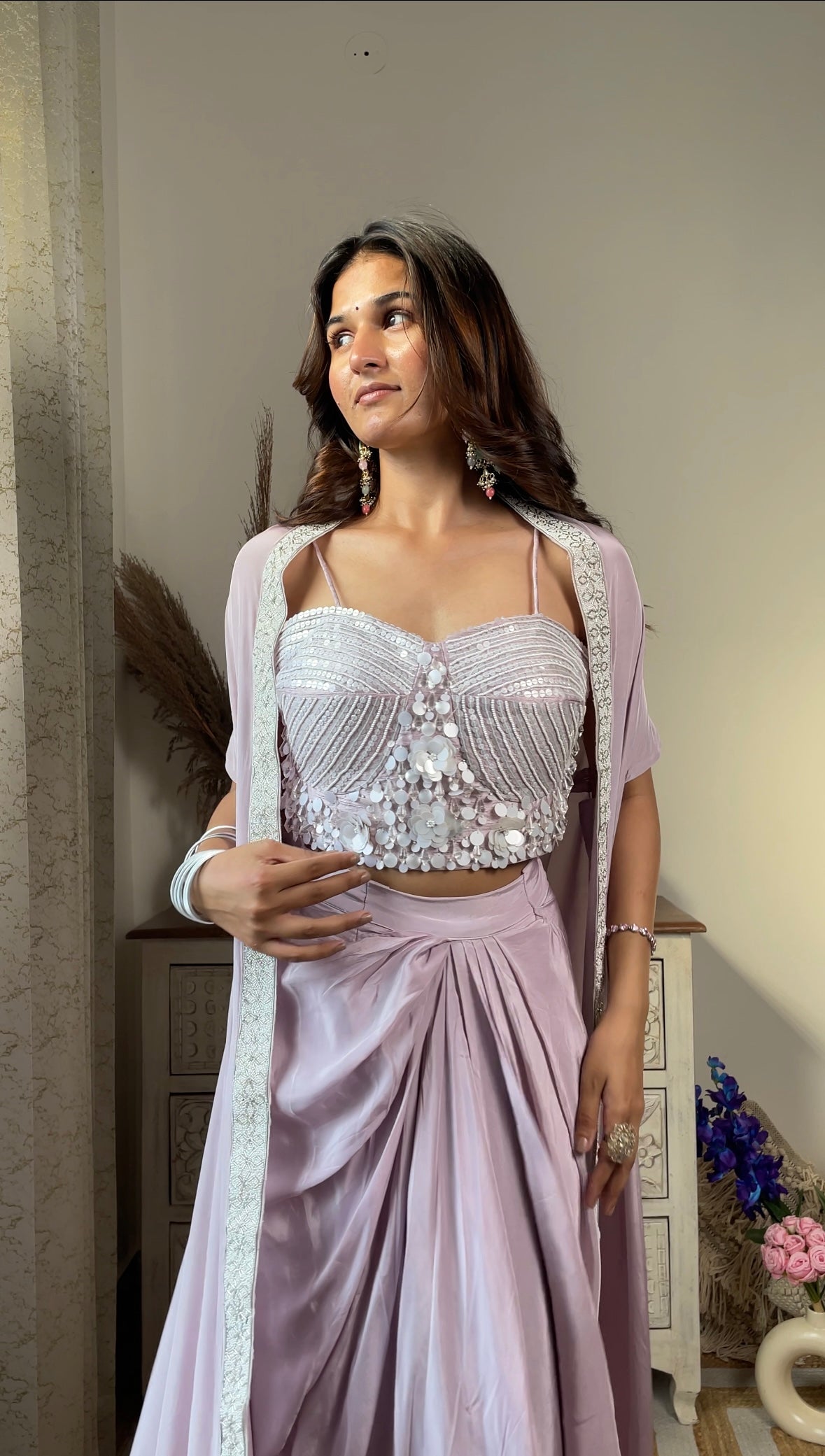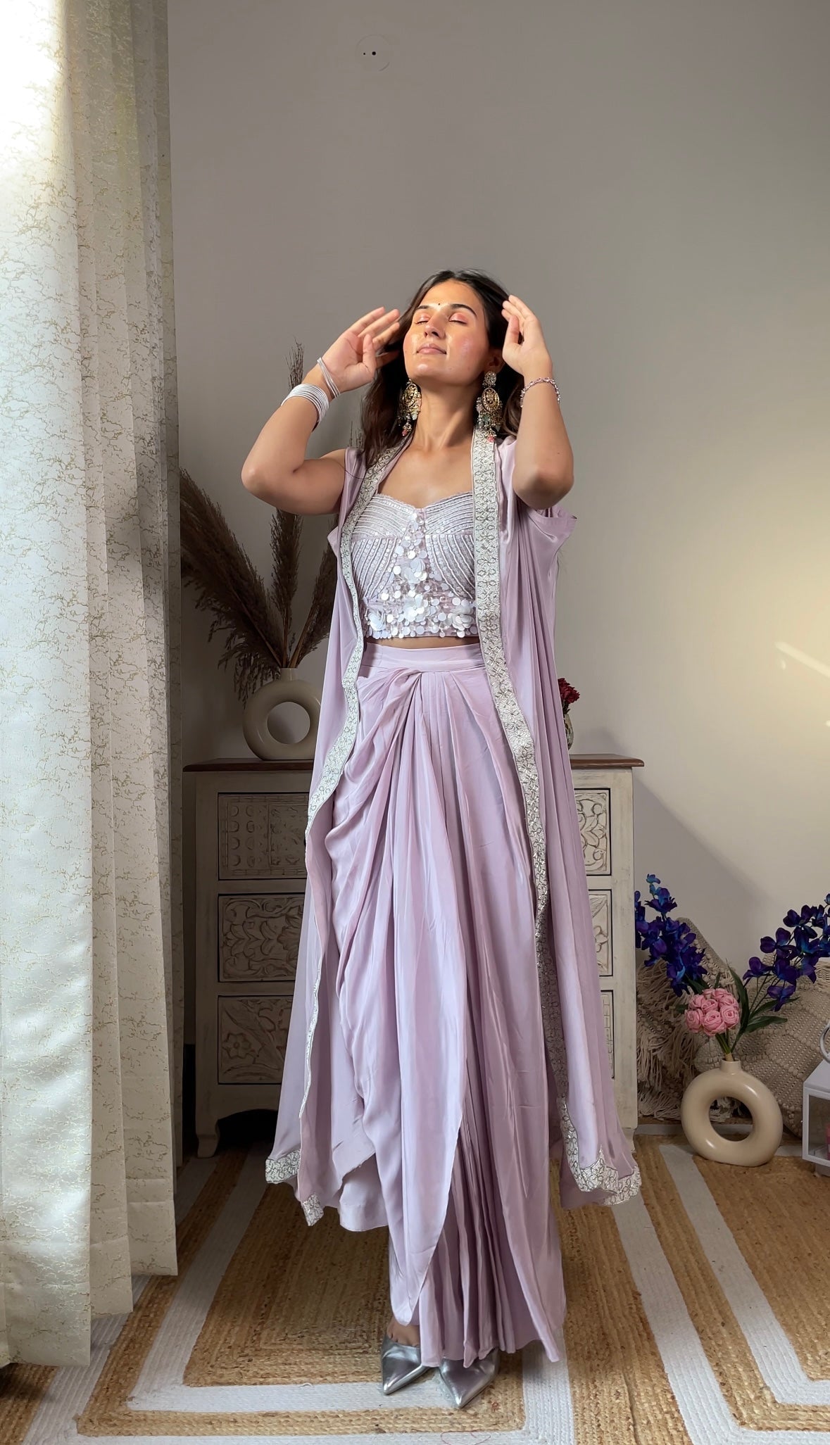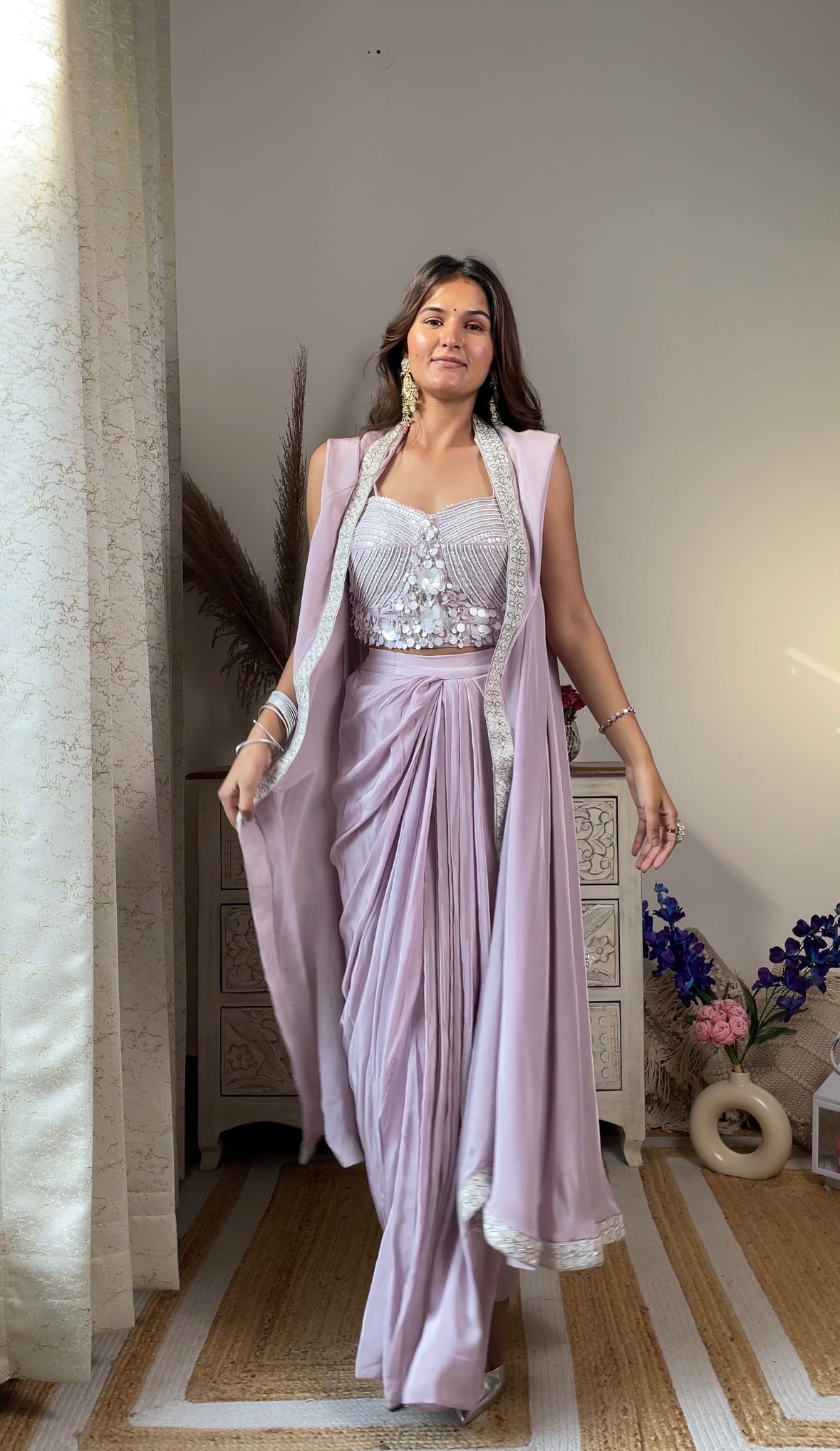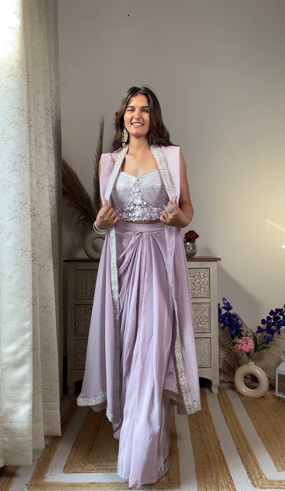 Lavender Crape Indo-Western Jacket Set includes a kurta, pants, and an open jacket. The jacket is lavender with light embroidery. The fabric is soft and easy to wear for hours. It looks stylish without feeling heavy. Suitable for weddings, festivals, or casual gatherings. Wear with simple shoes. Add small earrings or cufflinks to finish.