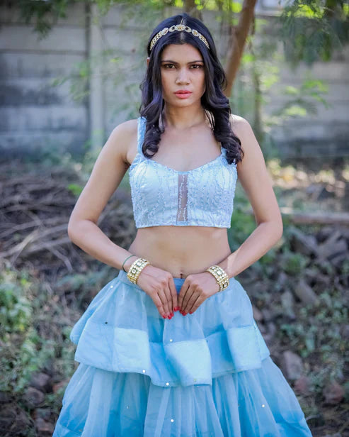 Step into the world of elegance with our Light Blue Organza Layered Crop Top and Skirt Set. Embrace the beauty of layering and express your unique style with grace and sophistication.