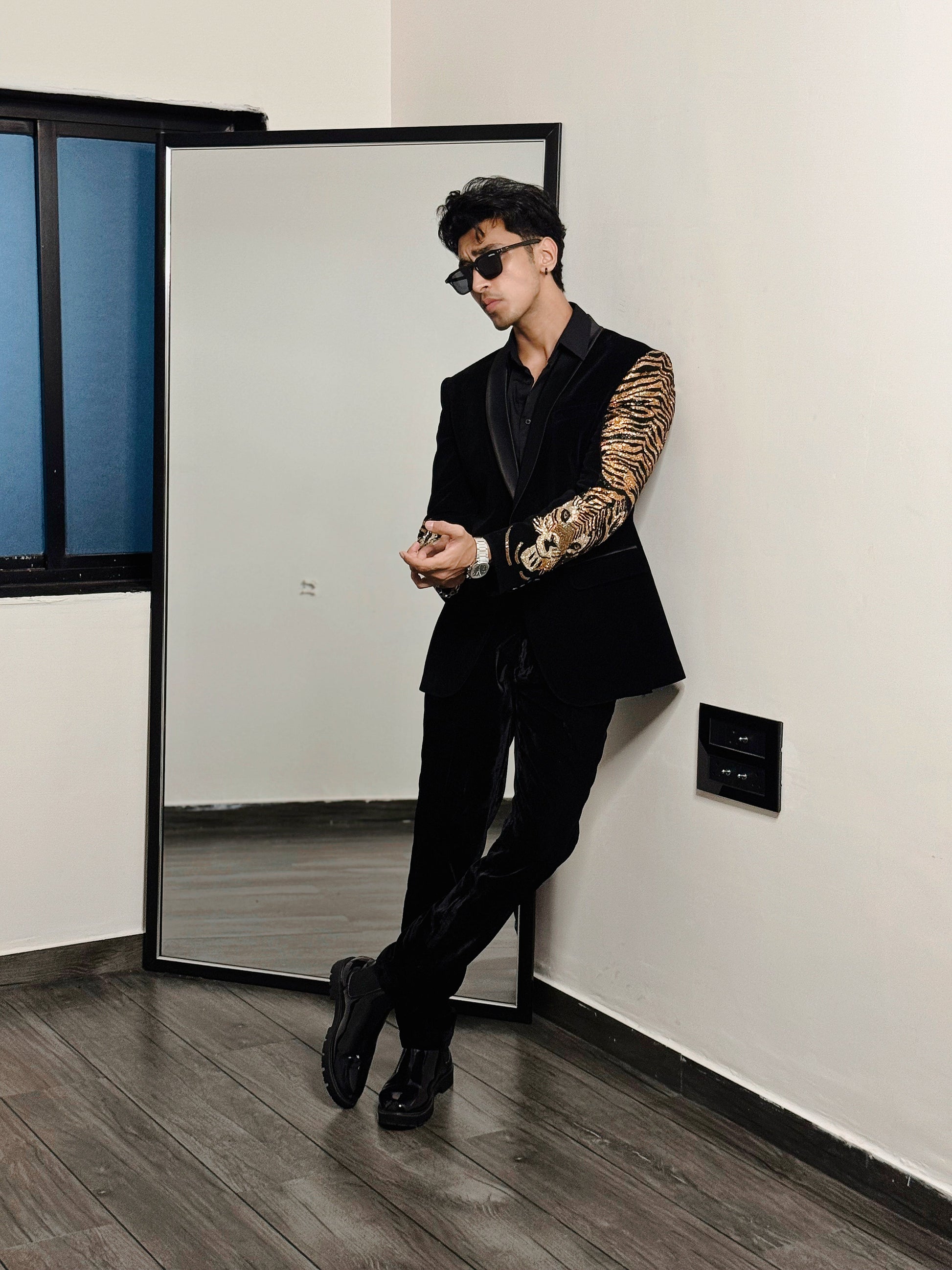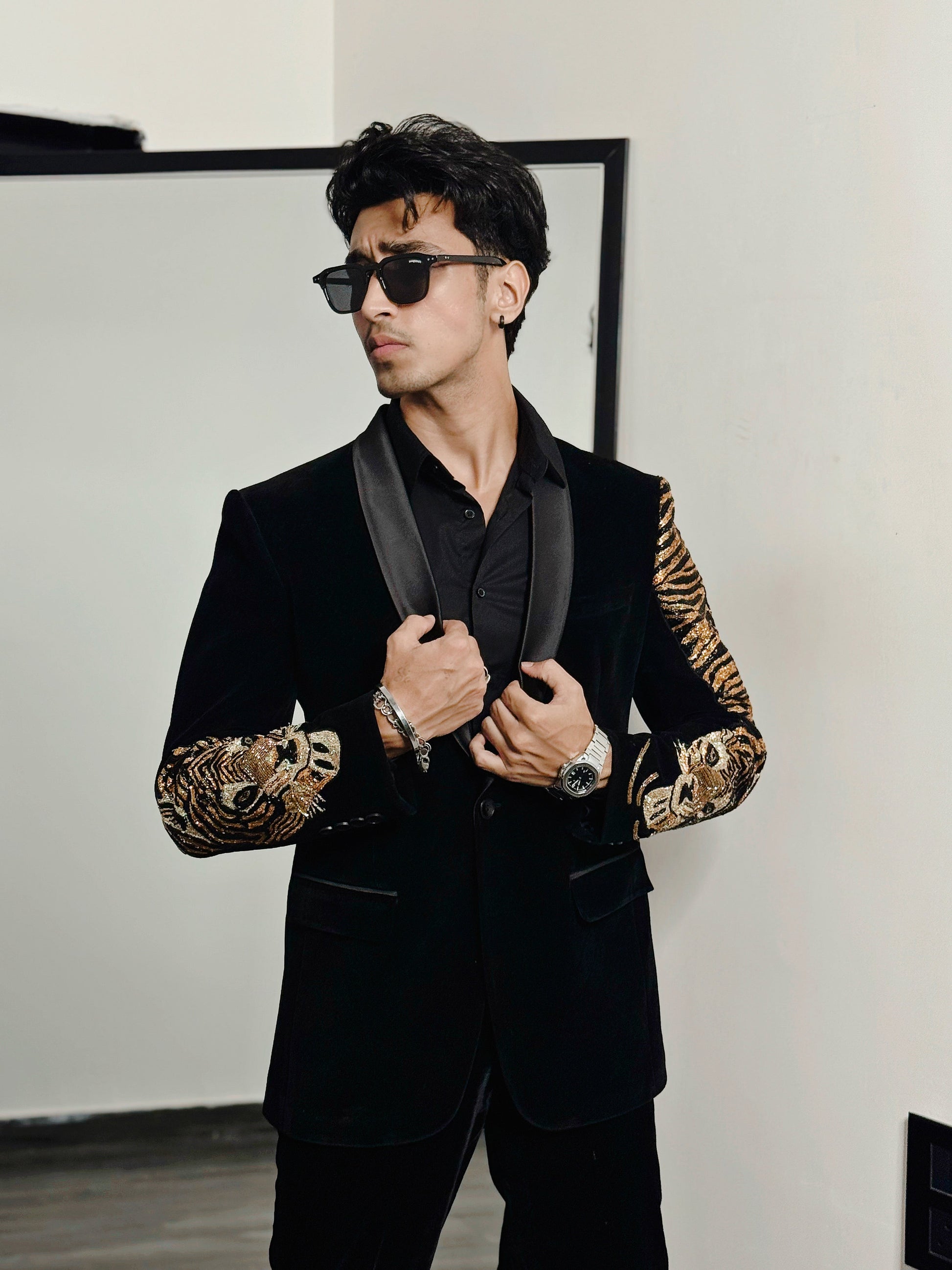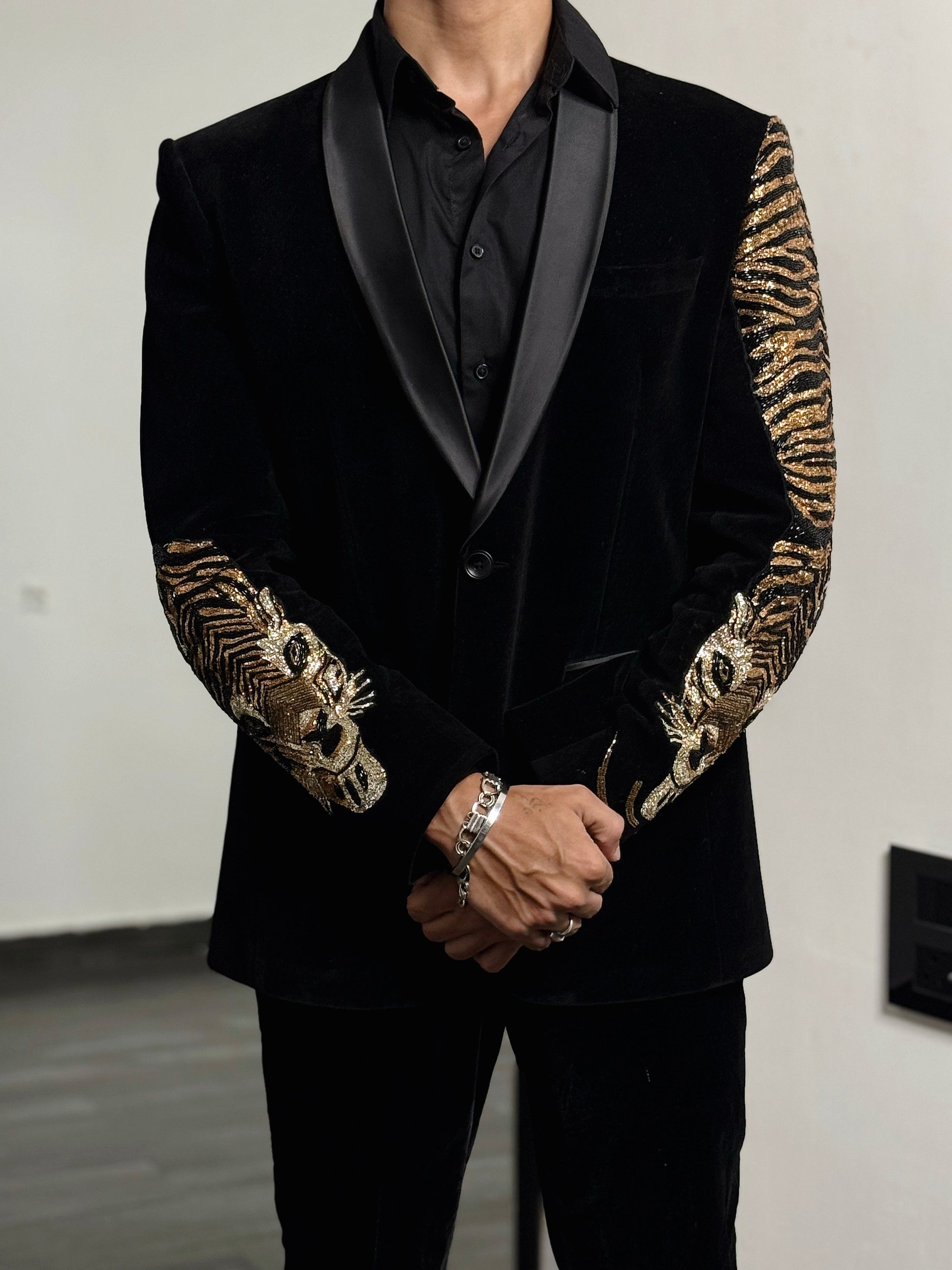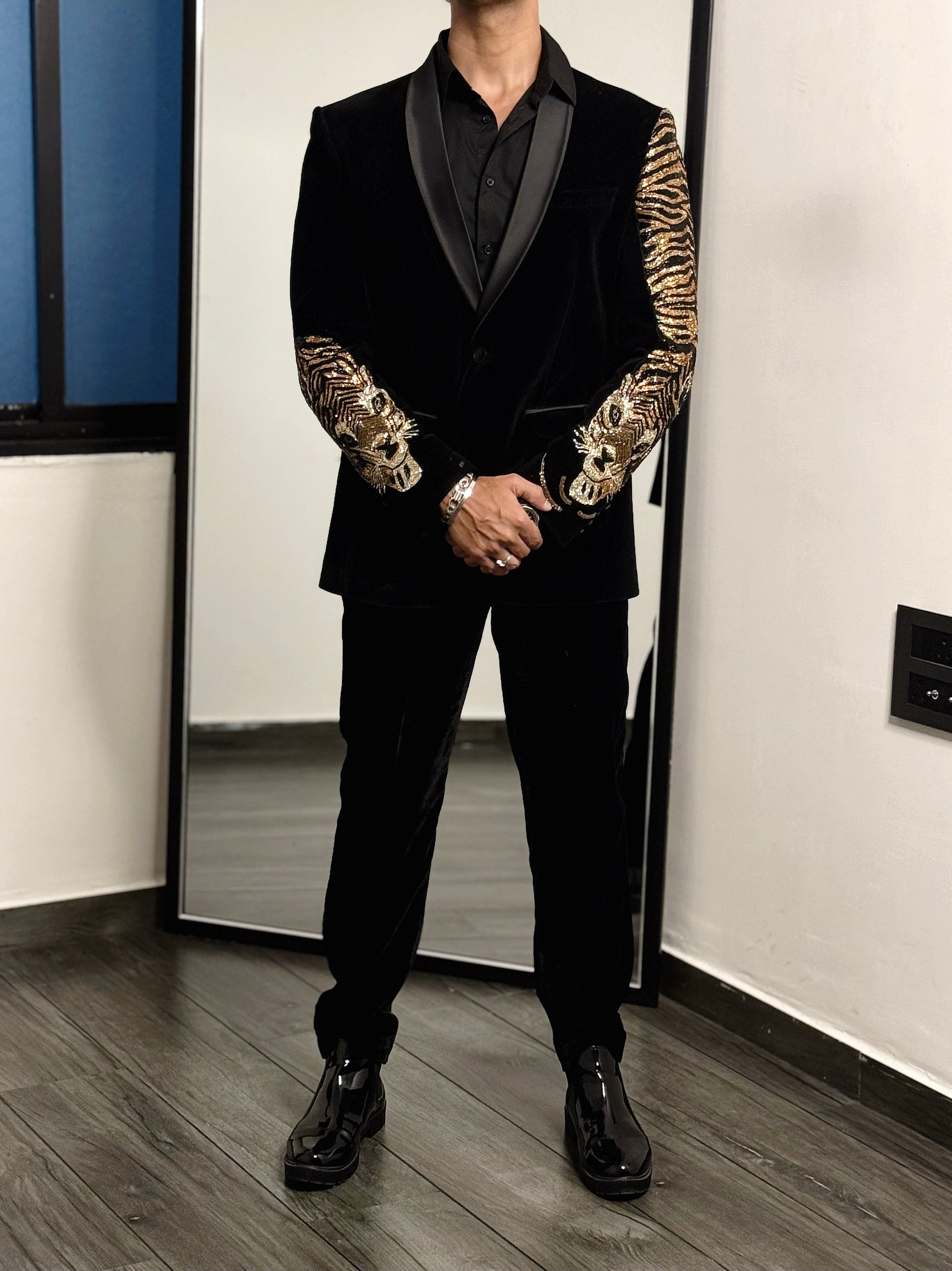 A lion blazer with pants is a matching outfit. The blazer has a clean cut and gives a sharp look. The pants are simple and comfortable. The fabric is a little shiny but not too bright. You can wear this set to parties or any formal event.