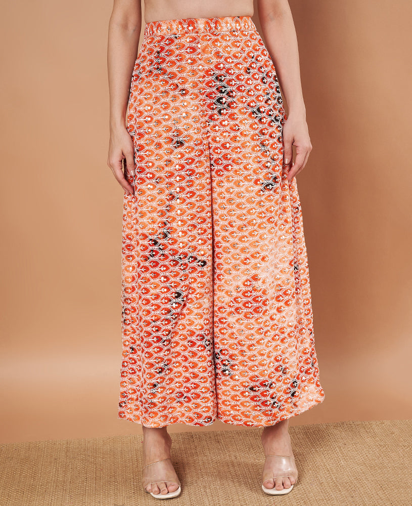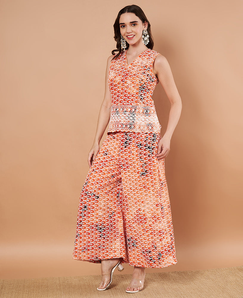 Red Silk Blouse & Net Worked Sharara With Feather Dupatta